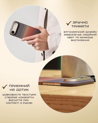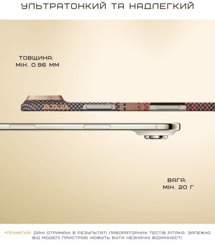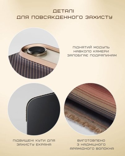 Виготовлений з арамідного волокна, чохол має тканинну текстуру, що надає преміумвідчуття на дотик. Вона стійка до подряпин і відбитків пальців, ніби м'яка оболонка, що обіймає пристрій, зберігаючи його оригінальні лінії без зайвого об'єму — товщина всього 1 мм і вага близько 20г роблять його майже непомітним, дозволяючи насолоджуватися природним відчуттям iPhone, ніби ви тримаєте його без чохла, але з впевненістю в щоденній безпеці.