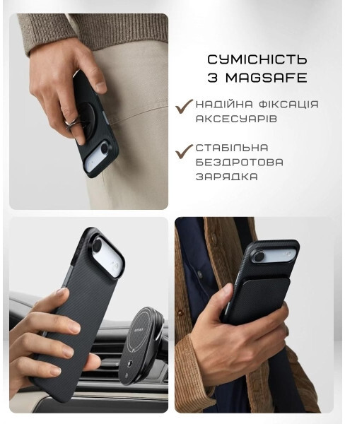 Інтегровані магніти MagSafe забезпечують безшовну роботу з бездротовою зарядкою, гаманцями чи аксесуарами, фіксуючи їх міцно без прослизання, а підняті краї захищають екран і камери від контакту з поверхнями, роблячи чохол практичним для повсякденного носіння в кишені чи сумці.