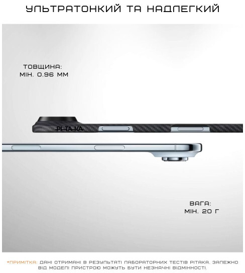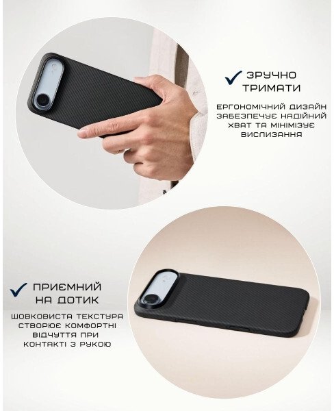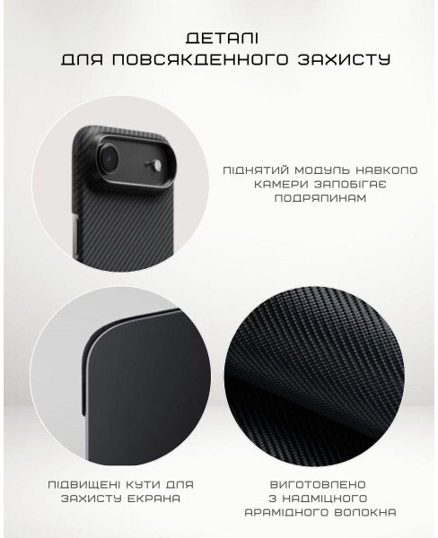 Виготовлений з арамідного волокна 600D, чохол має тканинну текстуру Twill, що надає преміумвідчуття на дотик. Вона стійка до подряпин і відбитків пальців, ніби м'яка оболонка, що обіймає пристрій, зберігаючи його оригінальні лінії без зайвого об'єму — товщина всього 1 мм і вага близько 20 г роблять його майже непомітним, дозволяючи насолоджуватися природним відчуттям iPhone, ніби ви тримаєте його без чохла, але з впевненістю в щоденній безпеці.