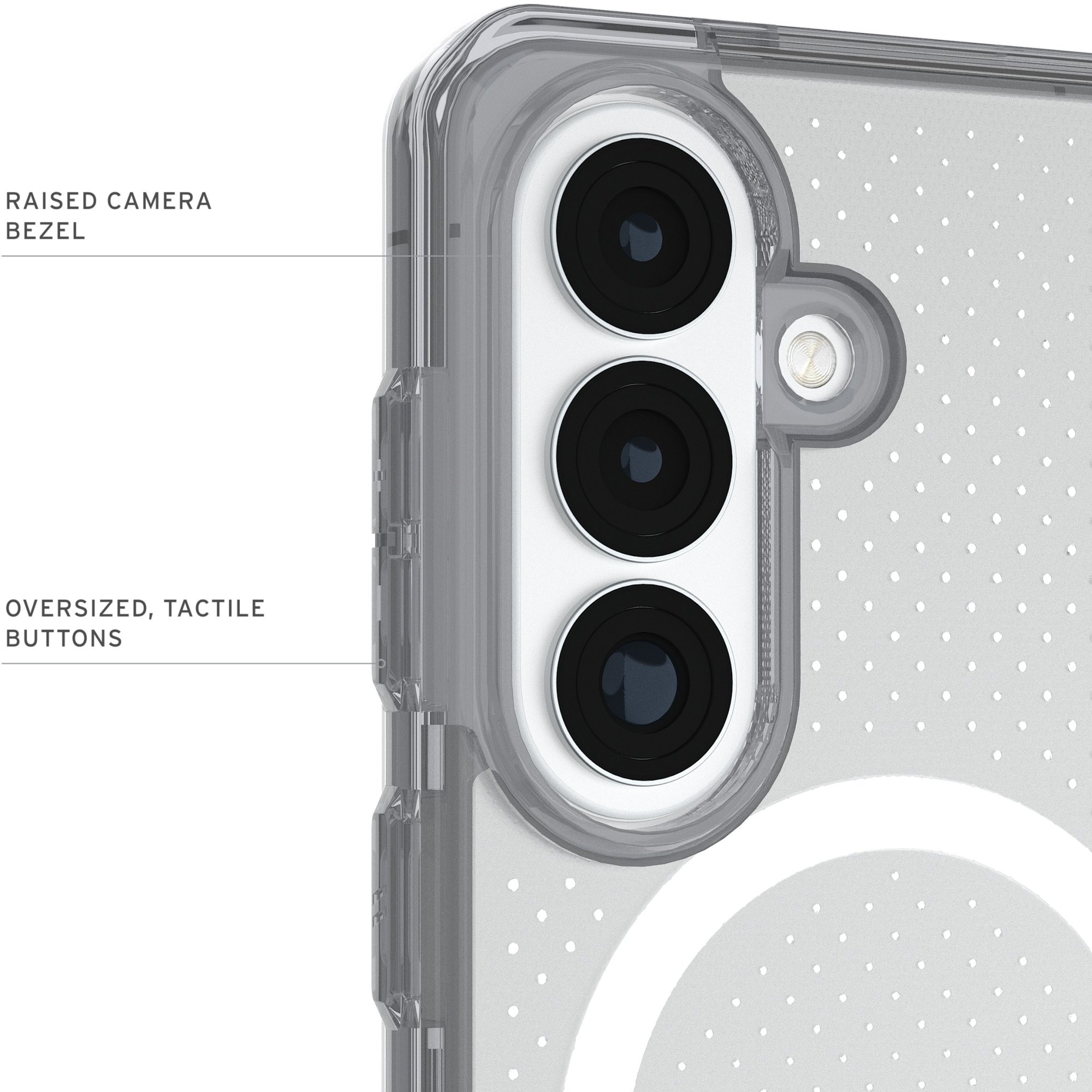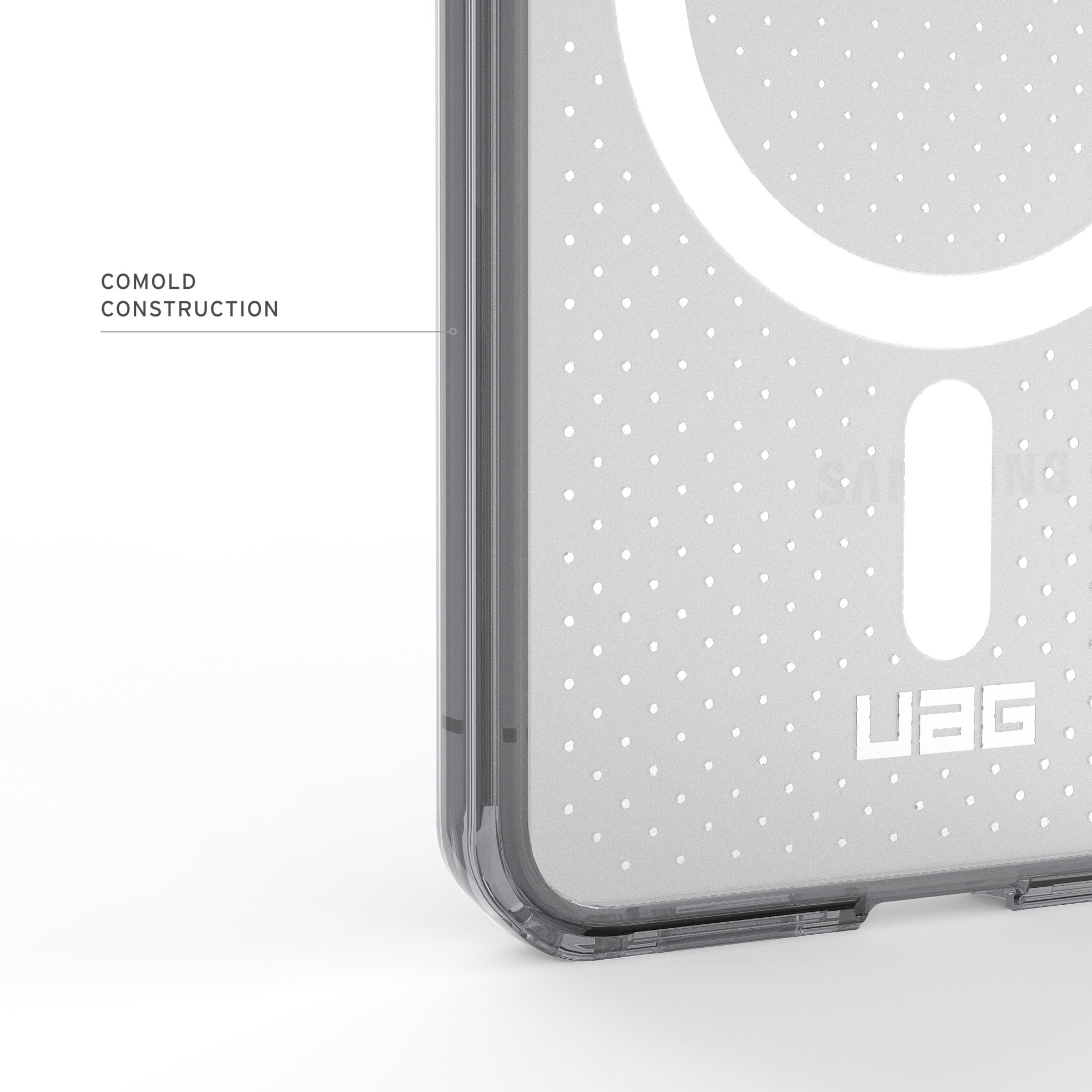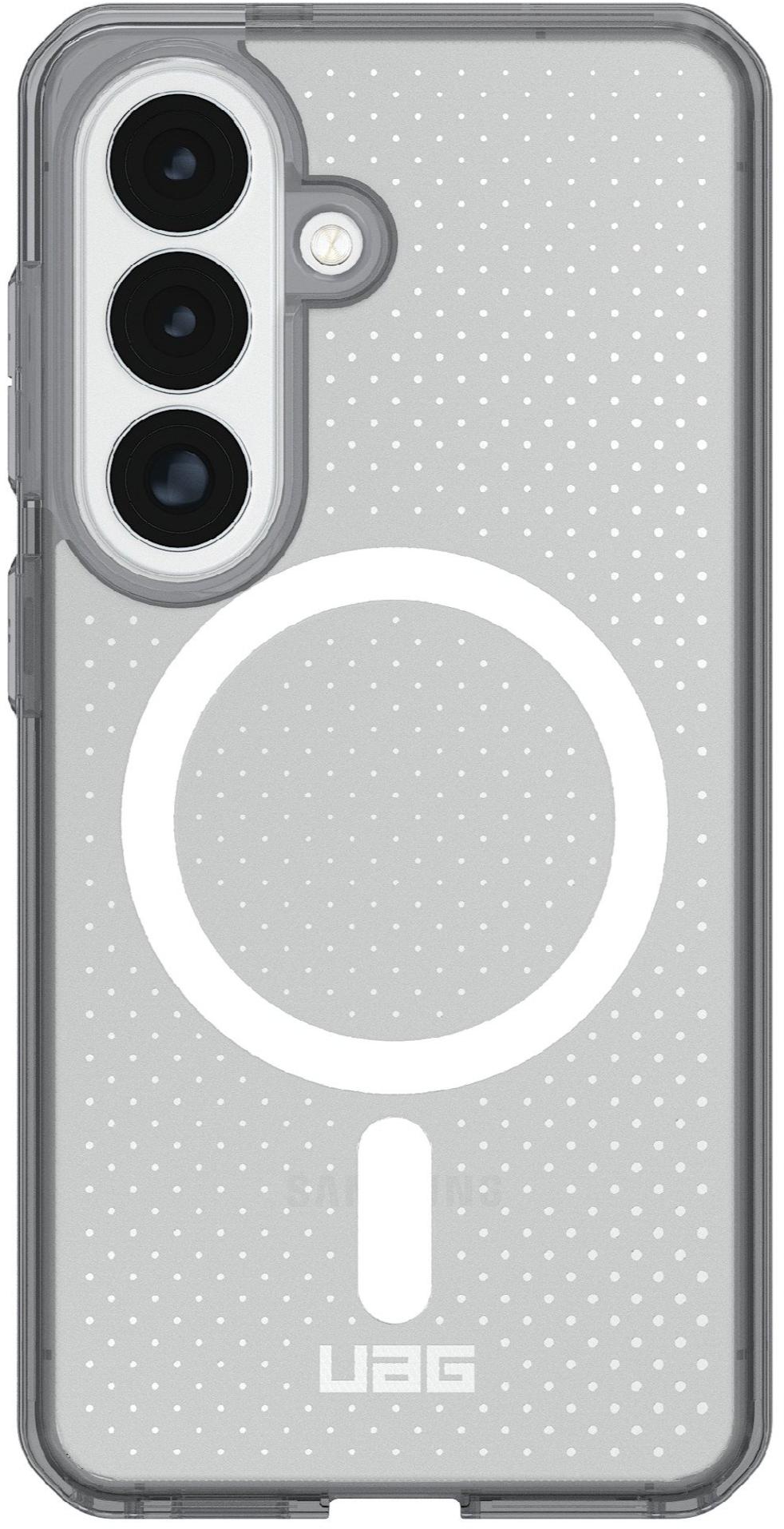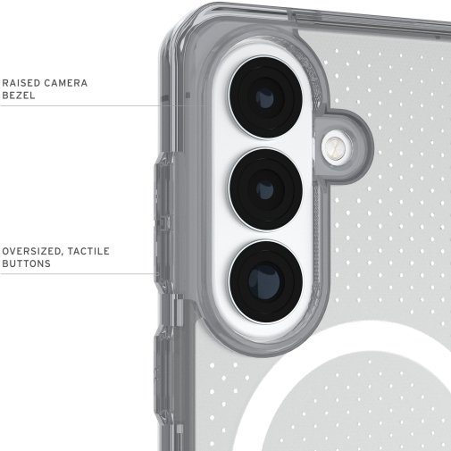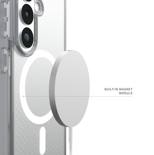 Чохол UAG Dot with Magnet для Samsung Galaxy S26 поєднує легку конструкцію з надійним захистом військового рівня, забезпечуючи безпеку смартфона без втрати комфорту використання. Його міцна комбінована конструкція з полікарбонату та термопластичного поліуретану доповнена ударостійким м’яким сердечником, який ефективно поглинає удари та захищає пристрій від пошкоджень під час щоденного використання. Завдяки піднятому захисному бортику навколо екрана зменшується ризик появи подряпин і пошкоджень при контакті з твердими поверхнями.