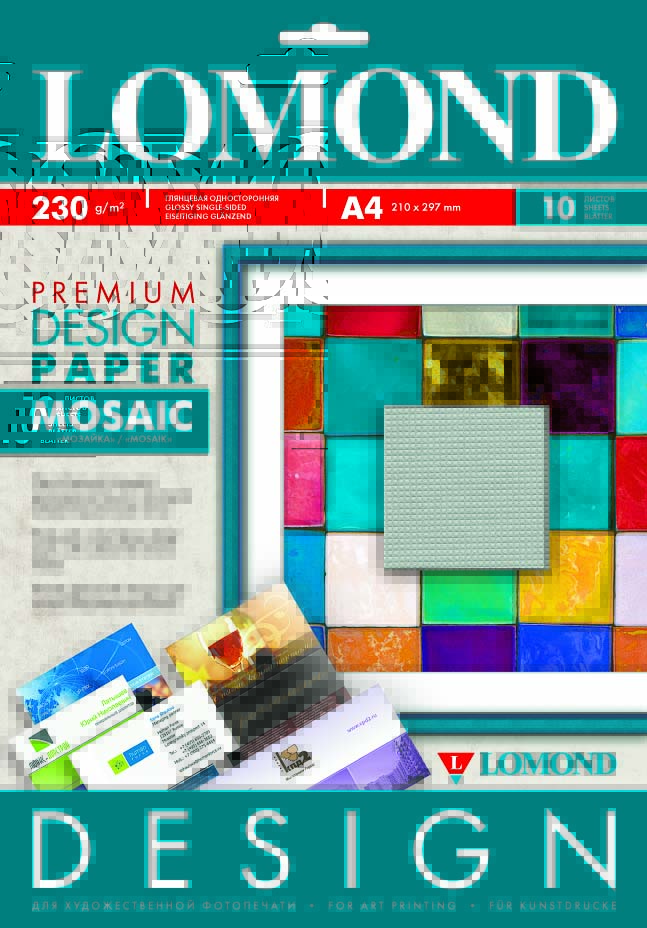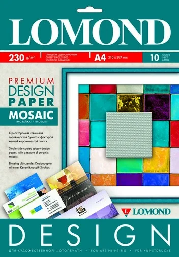 Lomond "Мозаїка" - це десять аркушів готового дизайнерського рішення. Фактура керамічної плитки покриває папір з однієї сторони, надаючи користувачу вже готовий фон для цікавих мистецьких звершень. Робоча поверхня аркушу забезпечить не тільки високу чіткість зображення, а й чудову передачу кольору. Він як найкраще підходить для друку фотографій, арт-постерів, дипломів, візиток, листівок та багатьох інших витворів комп'ютерної графіки.