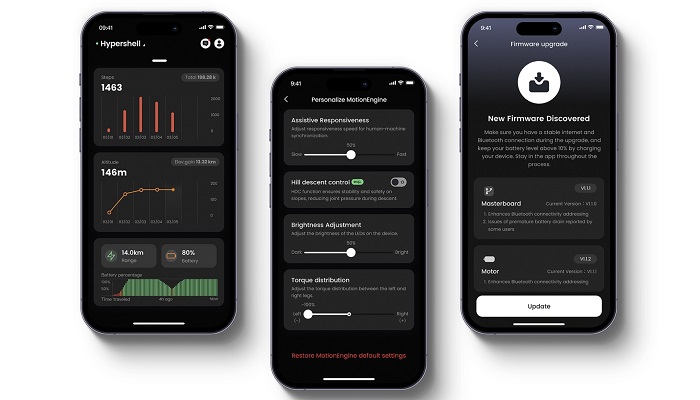 Система MotionEngine використовує високоточні датчики сили, положення та постури з затримкою 0,03 секунди, що роблять тисячі обчислень на секунду для оптимізації підтримки в реальному часі. З кожним наступним кроком алгоритм вивчає індивідуальну ходу та біомеханіку користувача, перетворюючись на персоналізований пристрій. Доступні 10 інтелектуальних режимів: ходьба, швидка ходьба, біг, ґрунтова дорога, гірська місцевість, велосипед, підйом, спуск, підйом і спуск сходами. Чотири режими роботи — Transparent, Eco, Hyper та Fitness — дозволяють гнучко налаштовувати рівень підтримки відповідно до активності.