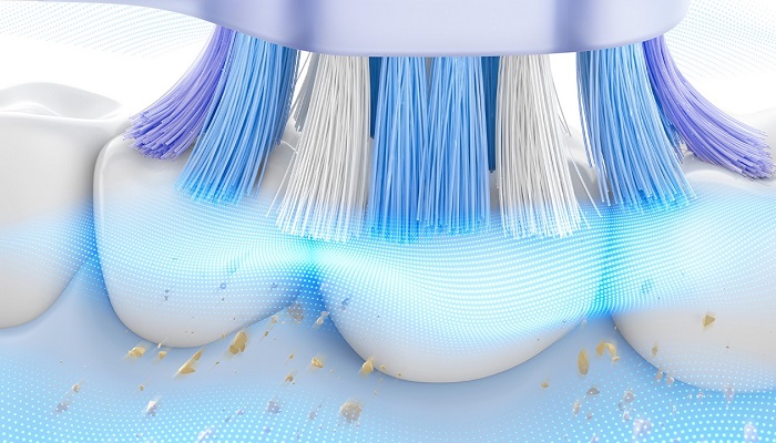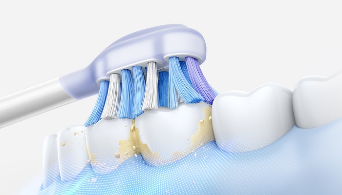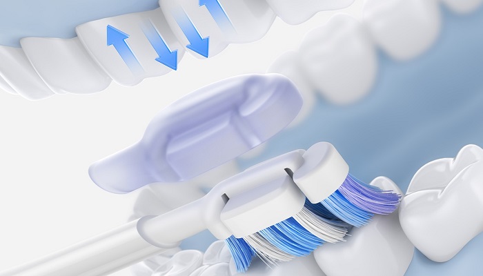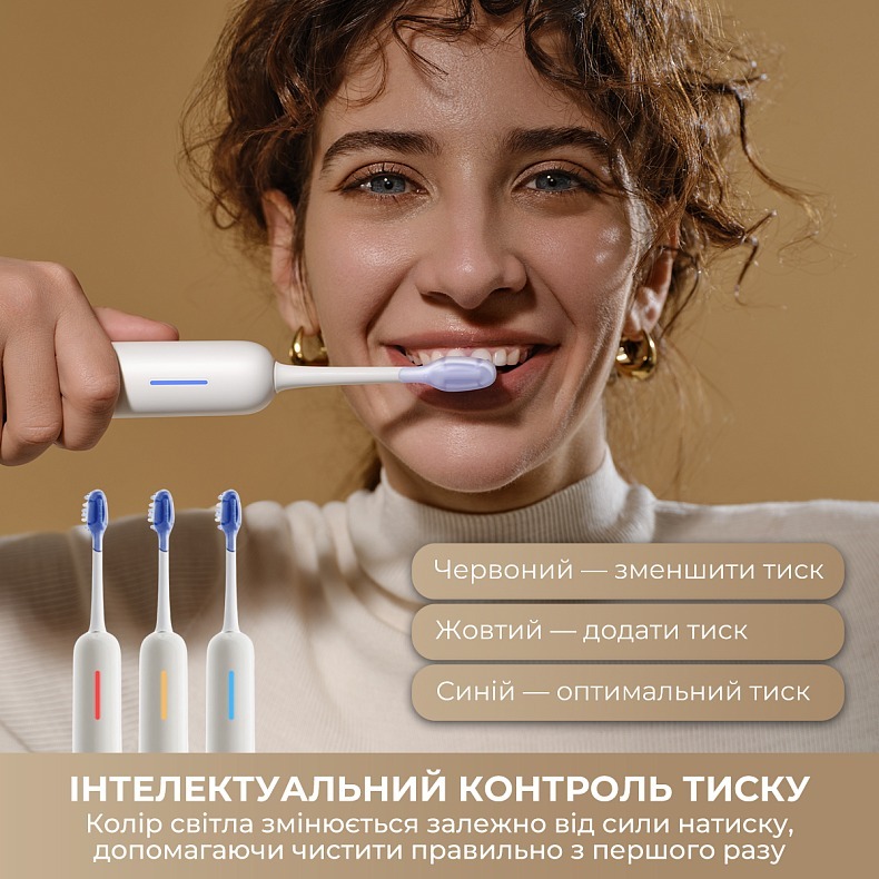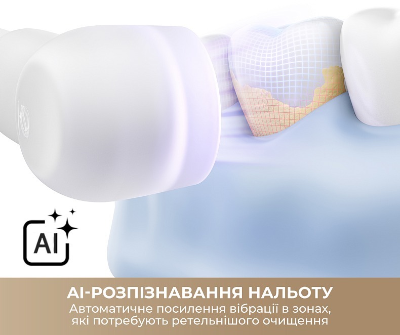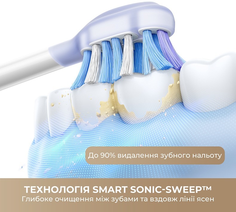 Головка щітки повністю вкрита м’якою гумою, що поглинає надлишковий тиск і мінімізує ризик кровоточивості ясен навіть під час інтенсивного чищення. Для максимального комфорту передбачено чотири режими роботи — Smart, Sensitive, Cleaning та Whitening, які легко перемикаються за допомогою двох чутливих фізичних кнопок з приємною тактильною віддачею.