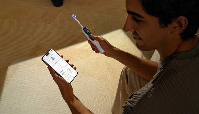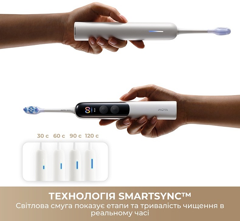 Особливою перевагою моделі став вбудований 0,96-дюймовий інтелектуальний екран, який відображає режими чищення, тривалість процесу та рівень заряду акумулятора. Підтримка 3–7 мов робить керування інтуїтивно зрозумілим, а вся інформація подається наочно та зручно. Додатково щітка оснащена синхронізованою світлодіодною смужкою SmartSync на задній панелі: під час чищення вона поступово підсвічується, а після завершення рекомендованого двоххвилинного циклу повністю спалахує, надаючи візуальний зворотний зв’язок у режимі реального часу.