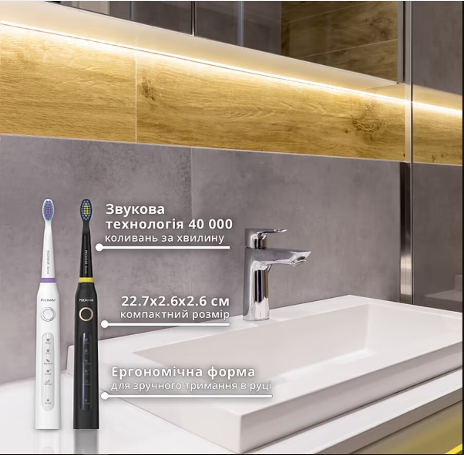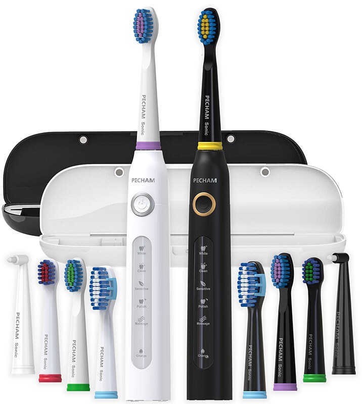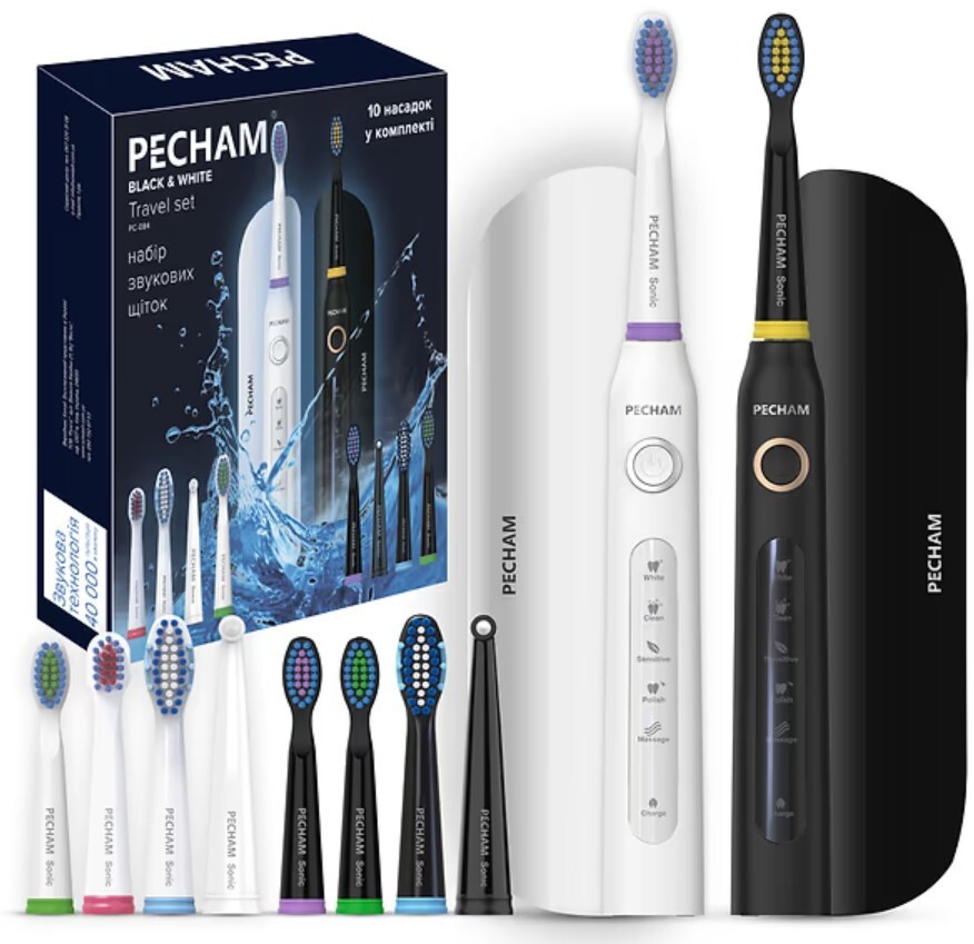 Електрична зубна щітка PECHAM Black and White Travel Set — це універсальний дорожній комплект, створений для повноцінного та дбайливого догляду за ротовою порожниною всієї сім’ї. Модель працює на основі звукової технології з частотою 40 000 коливань за хвилину, завдяки чому ефективно видаляє наліт, полірує емаль, масажує ясна та забезпечує відчутно чистіший результат порівняно зі звичайною щіткою. Клінічні дослідження підтверджують: уже через 7 днів щоденного використання зуби стають помітно білішими, а через 14 днів покращується стан ясен.