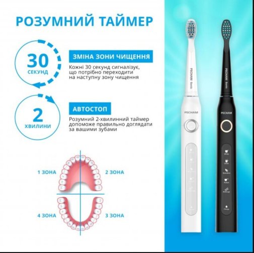 Щітка підходить як дорослим, так і дітям, зокрема користувачам із чутливими зубами, оскільки має п’ять режимів роботи: видалення нальоту, відбілювання, полірування, делікатний режим і повсякденне очищення. Це дозволяє індивідуально підібрати інтенсивність і тип чищення залежно від потреб. Для контролю якості гігієни передбачено таймер на 2 хвилини з інтервалами по 30 секунд, який нагадує про перехід до наступної зони.