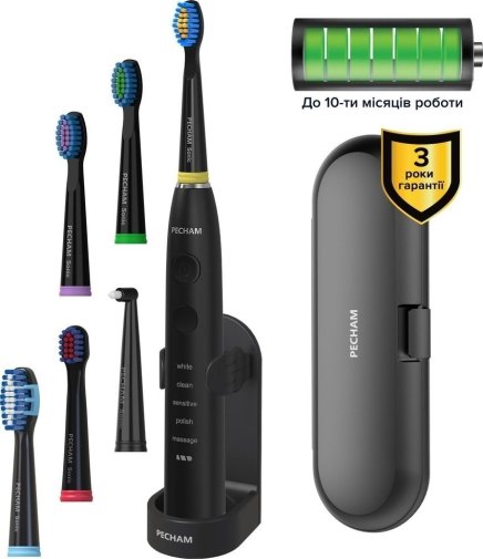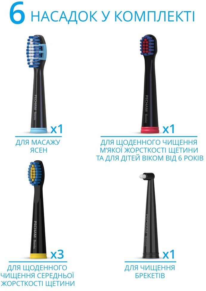 До комплекту входить 6 змінних насадок, яких вистачає на рік користування однією людиною. Якщо щітку використовує вся сім’я, можна придбати додаткові насадки з різнокольоровим маркуванням.
