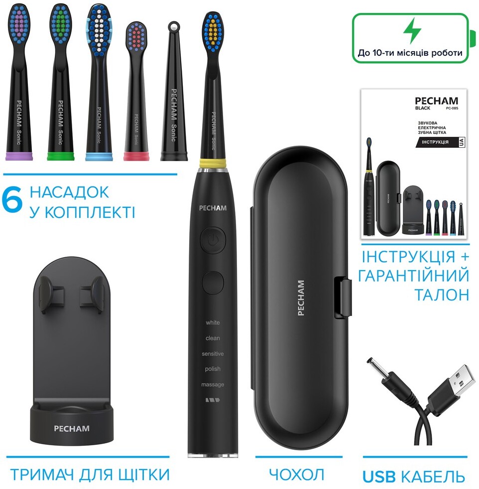 У комплекті користувач отримує не лише насадки та зарядний пристрій із USB-кабелем, а й зручний дорожній чохол для транспортування та настінний тримач, який допомагає акуратно зберігати щітку у ванній.