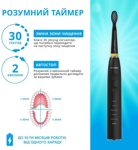 Модель оснащена зручним таймером, який кожні 30 секунд подає сигнал, нагадуючи про зміну зони чищення. Загальна тривалість циклу становить 2 хвилини — саме стільки радять стоматологи для якісного догляду. Звукові підказки допомагають навіть дітям швидко виробити правильні звички.
