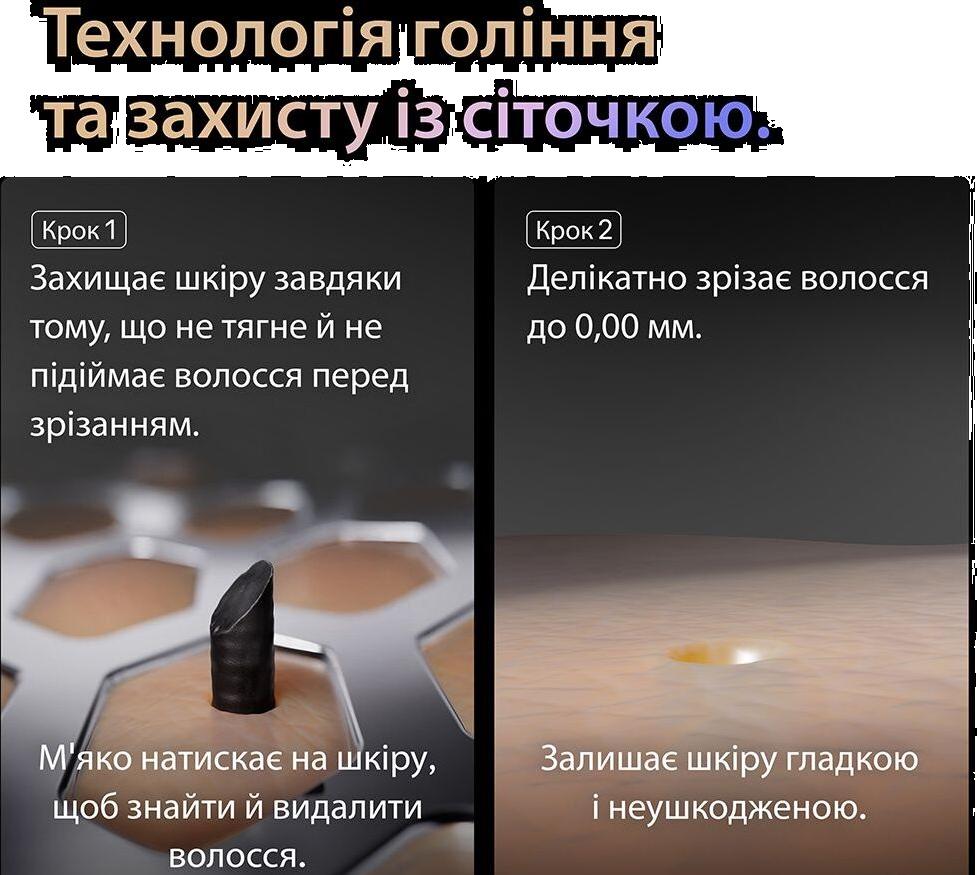 Серце бритви — сіткова система гоління з 5+1 синхронізованими елементами, які працюють у гармонії для досягнення найчистішого результату. Дві ультратонкі сіточки Ultra Thin забезпечують гладке гоління до 0,00 мм, м’яко ковзаючи по шкірі. Захисний елемент SkinGuard дбає про комфорт, мінімізуючи подразнення під час кожного руху. ProTrimmer із лезами з нержавіючої сталі ефективно зрізає навіть жорстке волосся — від 1-денної до 7-денної щетини, тоді як Direct&Cut-тример захоплює волоски, що ростуть у різних напрямках, забезпечуючи чистоту навіть на складних ділянках.