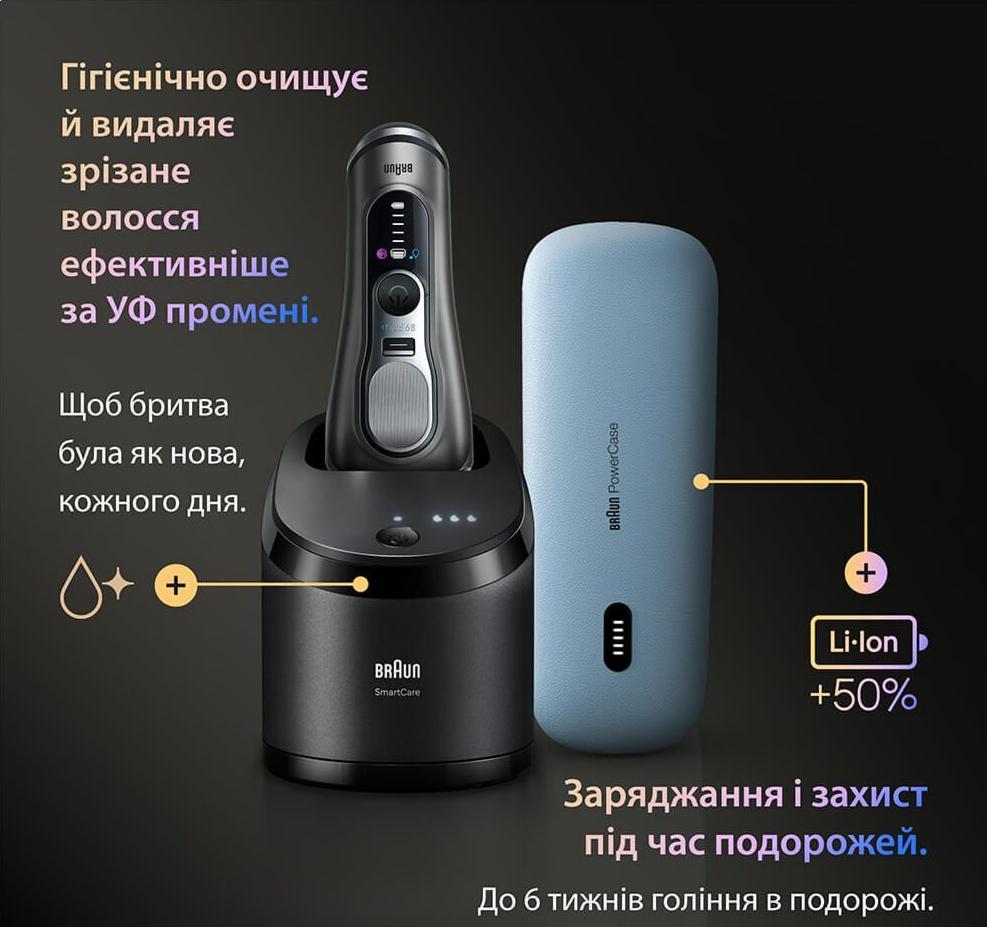 Особливої уваги заслуговує система очищення та підзарядки SmartCare 6-в-1. Вона автоматично очищує, дезінфікує, змащує, сушить і заряджає бритву, підтримуючи її ефективність, немов щойно з коробки. Крім того, дорожній футляр PowerCase із вбудованою підзарядкою дозволяє брати бритву в подорож і не хвилюватися про батарею.
