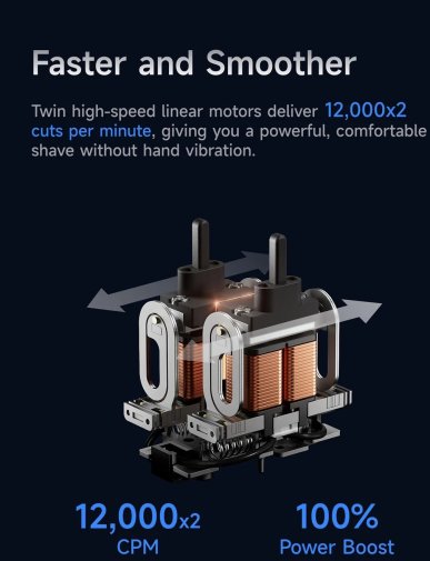 Серцем пристрою є два високошвидкісні лінійні двигуни, які працюють синхронно та виконують до 12 000 × 2 зрізів на хвилину. Така система гарантує високу потужність, рівномірне гоління без ривків і мінімальну ручну вібрацію. Додатковий комфорт забезпечує запатентована система Dual Suspension Shock Absorption з еластичним демпфуванням, що компенсує коливання моторів і зменшує навантаження на шкіру, дозволяючи бритві м’яко ковзати навіть на складних ділянках обличчя.