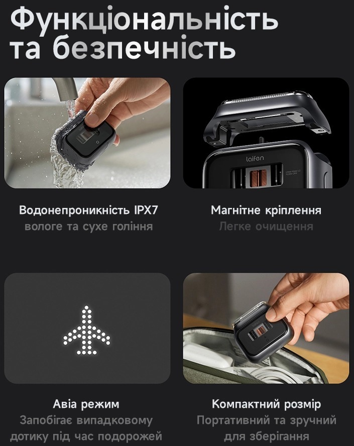 Монолітний корпус із міцним 2.5D-склом не лише виглядає стильно, а й запобігає потраплянню волосків усередину механізму, підвищуючи надійність і довговічність пристрою. Водонепроникність за стандартом IPX7 дозволяє використовувати Laifen P3 Pro як для сухого, так і для вологого гоління, а також легко очищати бритву під проточною водою. Магнітне кріплення робить догляд і очищення ще простішими.