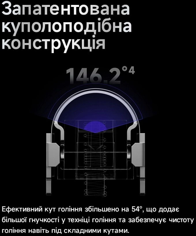 Запатентована куполоподібна конструкція з ефективним кутом гоління 146,2° збільшує гнучкість рухів на 54%, дозволяючи легко голитися навіть у складних зонах — під підборіддям, на шиї та вздовж лінії щелепи. Вісім направляючих елементів допомагають бритві точно повторювати контури обличчя, забезпечуючи рівномірний контакт і комфорт під час кожного руху.