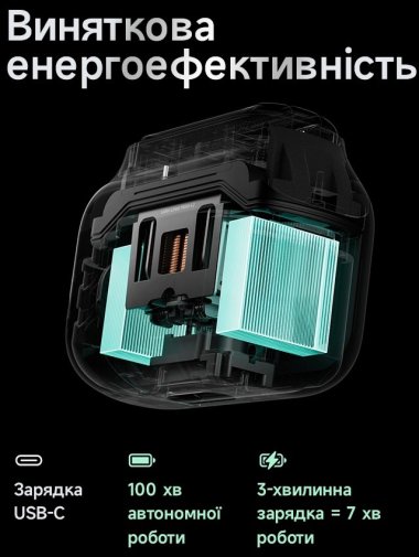 Бритва відзначається винятковою енергоефективністю: одного заряду вистачає до 100 хвилин автономної роботи, а швидка зарядка через USB-C дозволяє за 3 хвилини отримати до 7 хвилин гоління. Для подорожей передбачений авіарежим, який запобігає випадковому ввімкненню, а компактний розмір робить пристрій зручним для зберігання та транспортування.