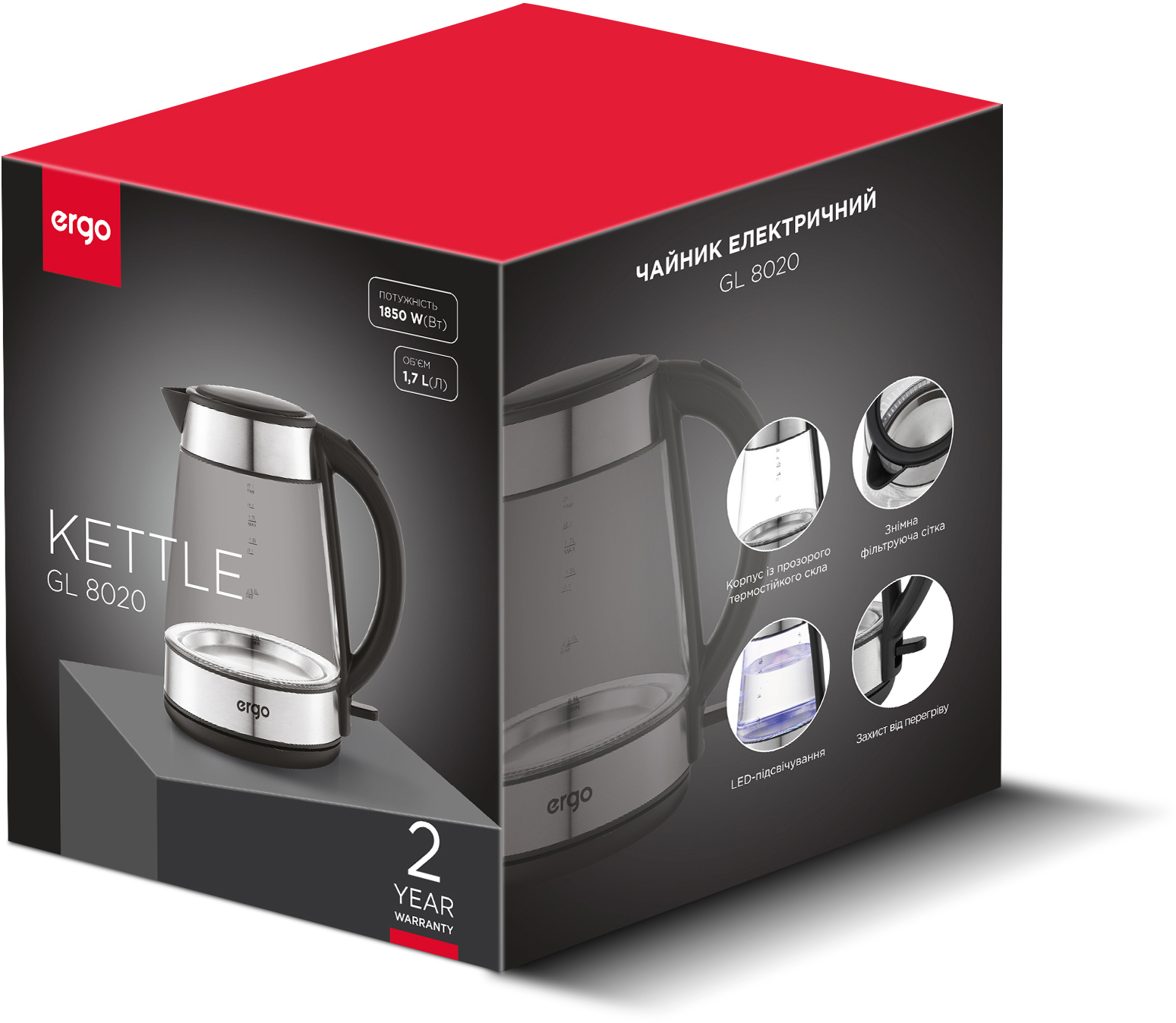 Електрочайник ERGO GL 8020 ідеально підходить для щоденного використання вдома чи в офісі, поєднуючи швидкість, безпеку та стильний сучасний дизайн.