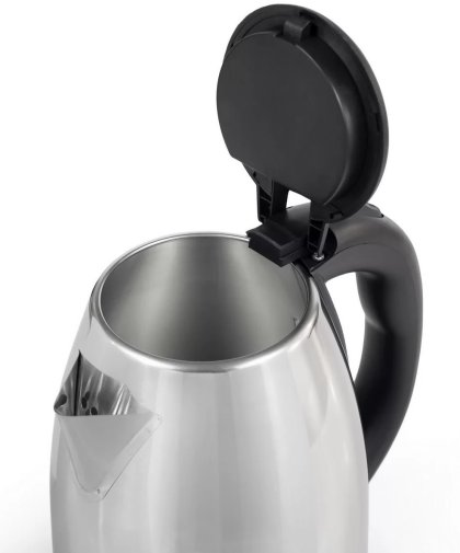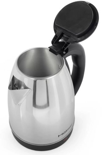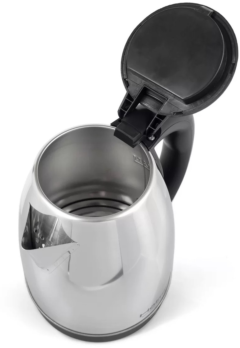 Електрочайник потужністю 1500 Вт об’ємом 1,8 л. Корпус виконаний з металу та пластику. Оснащений прихованим нагрівальним елементом, автоматичним вимкненням при закипанні та захистом від перегріву. Колір – нержавіюча сталь із чорним.