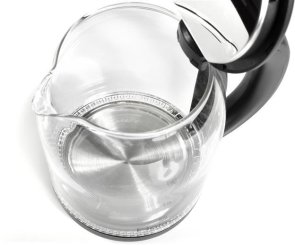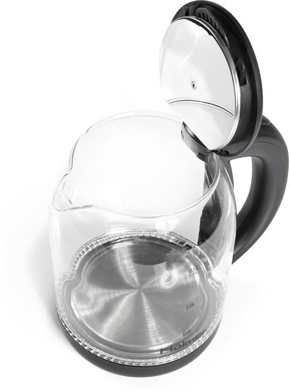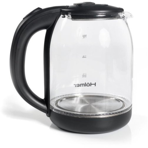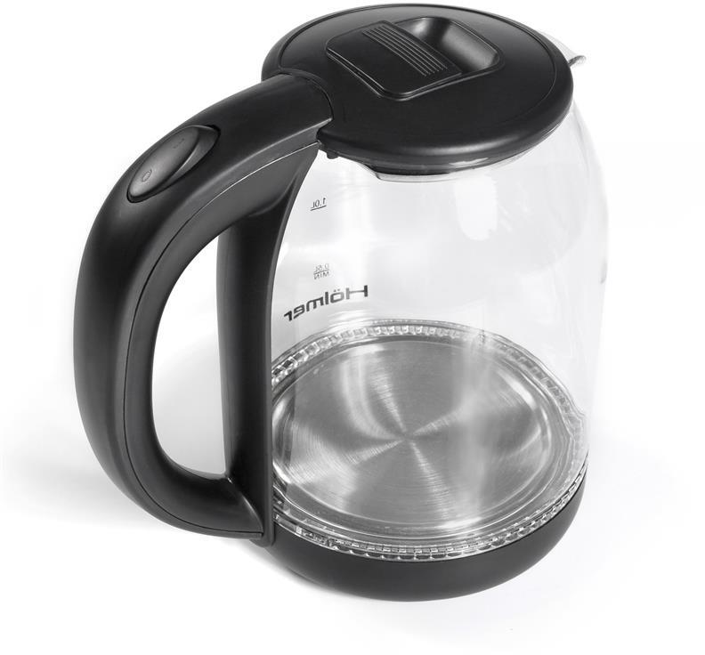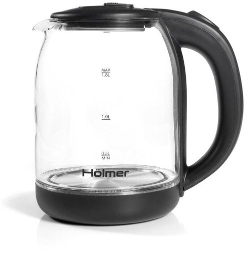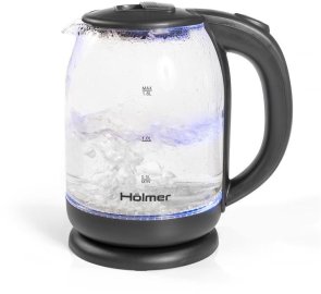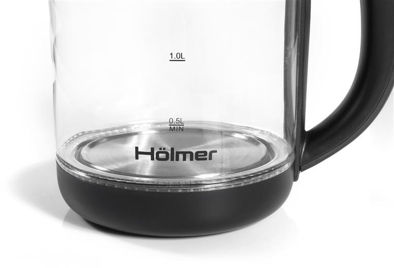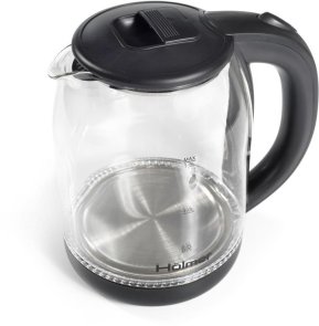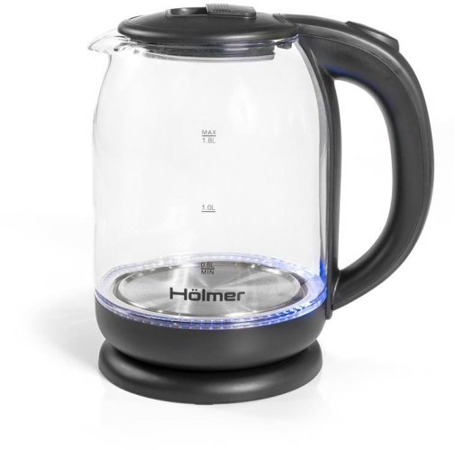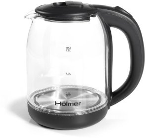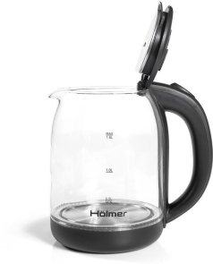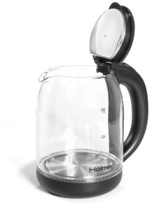 Чаша електрочайника HKS-2025 виготовлена з високоякісного термостійкого скла, об’єм складає 1.8 літра. Для зручного набору води або чищення, кришка відкривається під кутом понад 90°. Чайник Holmer HKS-2025 має чорний колір та матове покриття, а також LED – підсвічування яке сигналізує про роботу чайника та красиво і яскраво підсвічує воду блакитним кольором.