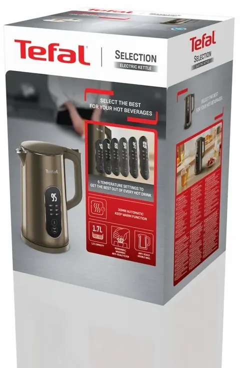 Електрочайник Tefal Selection поєднує стильний дизайн, сучасні технології та максимальну зручність у використанні, даруючи повний контроль над процесом нагрівання води та ідеальний результат щоразу. Завдяки 6 температурним режимам — 40°C, 70°C, 80°C, 90°C, 95°C і 100°C — ви легко підберете оптимальну температуру для будь-якого напою: ніжного трав’яного настою, ароматного чаю, насиченої кави чи дитячої суміші.