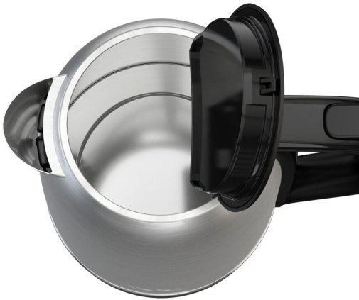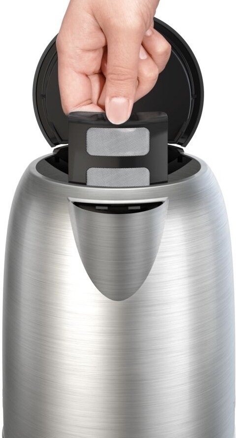 Для максимальної зручності чайник оснащений механізмом відкривання однією рукою: достатньо натиснути кнопку, і кришка автоматично відкривається, що спрощує наповнення та очищення пристрою. Знімний мийний фільтр проти накипу гарантує чистішу воду і покращений смак напоїв, а його легке очищення робить догляд за чайником простим та швидким.