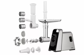 Пристрій вирізняється широким комплектом насадок, що розширюють його функціональність. У наборі є три металеві решітки з отворами 3 мм, 5 мм і 7 мм для різного помелу, а також насадки для приготування ковбасок і кеббе. Крім того, м’ясорубка оснащена насадкою для томатного чи ягідного соку та чотирма терками (велика, стандартна, шатківниця та для дерунів), що робить її ідеальним вибором для різноманітних кулінарних завдань.