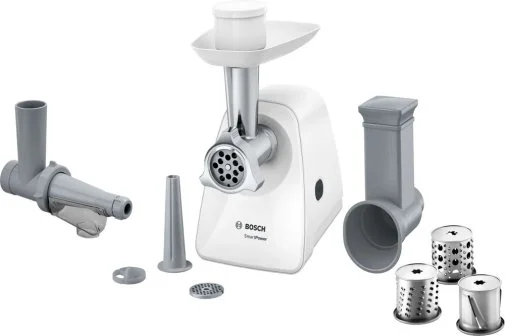 Електром'ясорубка Bosch MFW2517W — це потужний та універсальний кухонний прилад, який дозволяє швидко та ефективно обробляти м’ясо і готувати різноманітні страви. Завдяки потужному мотору 1500 Вт, м’ясорубка легко перемелює будь-які продукти за лічені хвилини, забезпечуючи максимум продуктивності при мінімальних витратах часу.