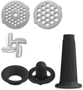 Комплект поставки включає повний набір аксесуарів для максимальної кулінарної versatility. Насадка для домашніх ковбас дозволяє легко готувати ковбаски, сосиски та сардельки прямо вдома: натуральна оболонка кріпиться на насадку, насадка — на шнек, і залишається лише контролювати процес наповнення. Насадка для кебе відкриває можливість готувати популярні східні м'ясні страви. Два диски для фаршу різного діаметру дозволяють регулювати ступінь помелу — від крупного для котлет до дрібного для паштетів і дитячого харчування.