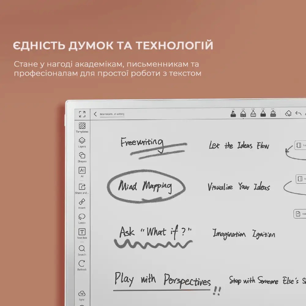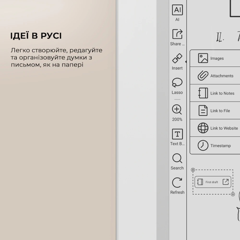 Писати на Note Max — одне задоволення: чутливий стилус (входить у комплект) і технологія BOOX Super Refresh роблять відчуття максимально близьким до справжньої ручки й паперу. Ви можете виділяти текст, додавати рукописні примітки, малювати діаграми та схеми, використовувати різні типи пензлів і інструмент фігур. Функція розділеного екрана дозволяє одночасно читати документ і вести конспект, а інструмент вставки — швидко збирати посилання, файли та вебсторінки в одному місці, а гіперпосилання в PDF-шаблонах працюють одним дотиком.