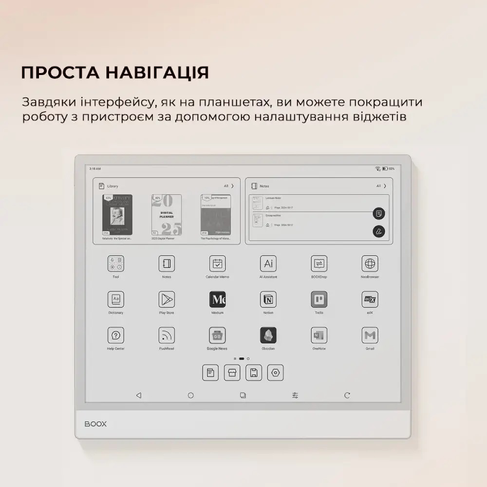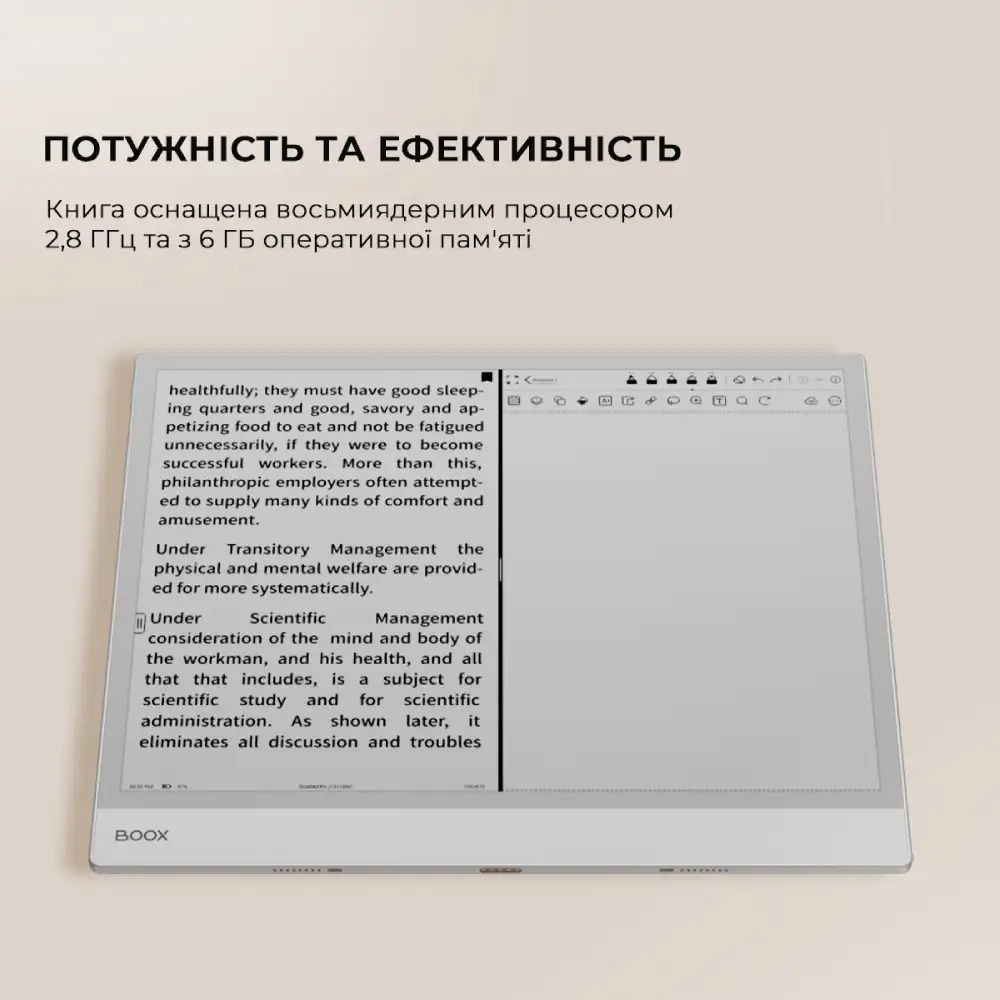 За продуктивність відповідає восьмиядерний процесор 2,8 ГГц і 6 ГБ оперативної пам’яті, тому багатозадачність і листання сторінок відбуваються миттєво й без затримок. Пристрій працює на Android 13, тож ви можете встановлювати будь-які сторонні додатки, створювати віджети та налаштовувати головний екран під себе. Синхронізація нотаток і файлів між усіма пристроями BOOX відбувається через Onyx Cloud, а передача документів з комп’ютера чи смартфона — через BOOXDrop.