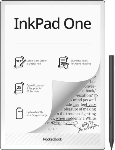 PocketBook InkPad One — це електронна книга нового рівня з великим 10,3-дюймовим екраном і підтримкою активного стилуса, що поєднує в собі зручність читання та можливості для нотаток. Пристрій орієнтований на тих, хто хоче отримати повноцінний інструмент для роботи з текстом — як у форматі читання, так і у форматі письма від руки. Стильний корпус із преміального алюмінію без зовнішніх кнопок надає пристрою сучасного мінімалістичного вигляду.