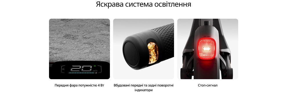 Безпеку під час руху гарантує ефективна гальмівна система з переднім барабанним та заднім електронним гальмом, а також яскрава система освітлення з 4-ватною передньою фарою, вбудованими поворотниками та стоп-сигналом. Уся важлива інформація — швидкість, режим їзди та заряд батареї — відображається на 3-дюймовому дисплеї, добре помітному навіть при яскравому сонці.
