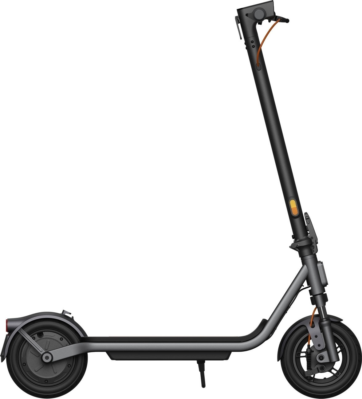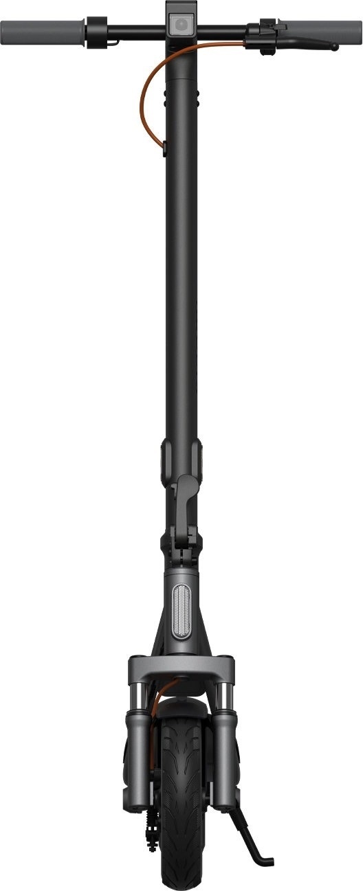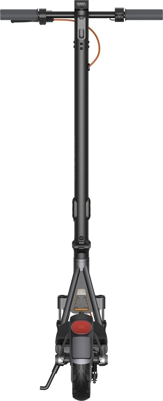 Для комфортного руху на нерівних дорогах самокат оснащений переднім подвійним пружинним амортизатором з ходом 25 мм, який ефективно гасить вібрації та удари від нерівностей. 10-дюймові пневматичні шини добре справляються зі швидкісними горбами, гравієм та нерівним асфальтом, покращуючи прохідність та стабільність керування. Гальмівна система — барабанні гальма спереду та E-ABS ззаду — забезпечує надійне й рівномірне гальмування в різних дорожніх умовах.
