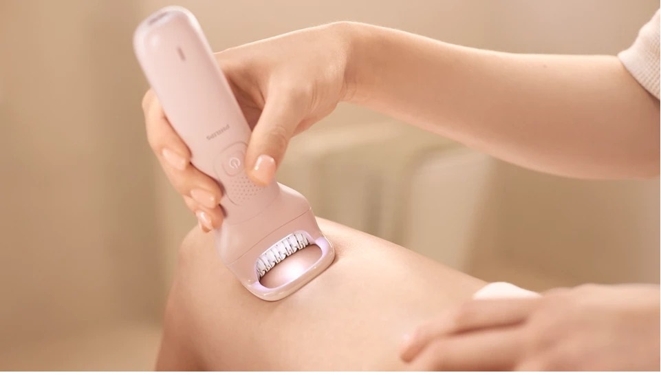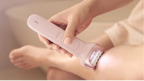Епілятор 100% водонепроникний, тому підходить для сухого та вологого використання — у душі або біля раковини. Тепла вода допомагає розслабити шкіру й зробити процедуру ще комфортнішою, а ергономічна ручка з нековзним покриттям забезпечує надійний контроль навіть у вологих умовах.