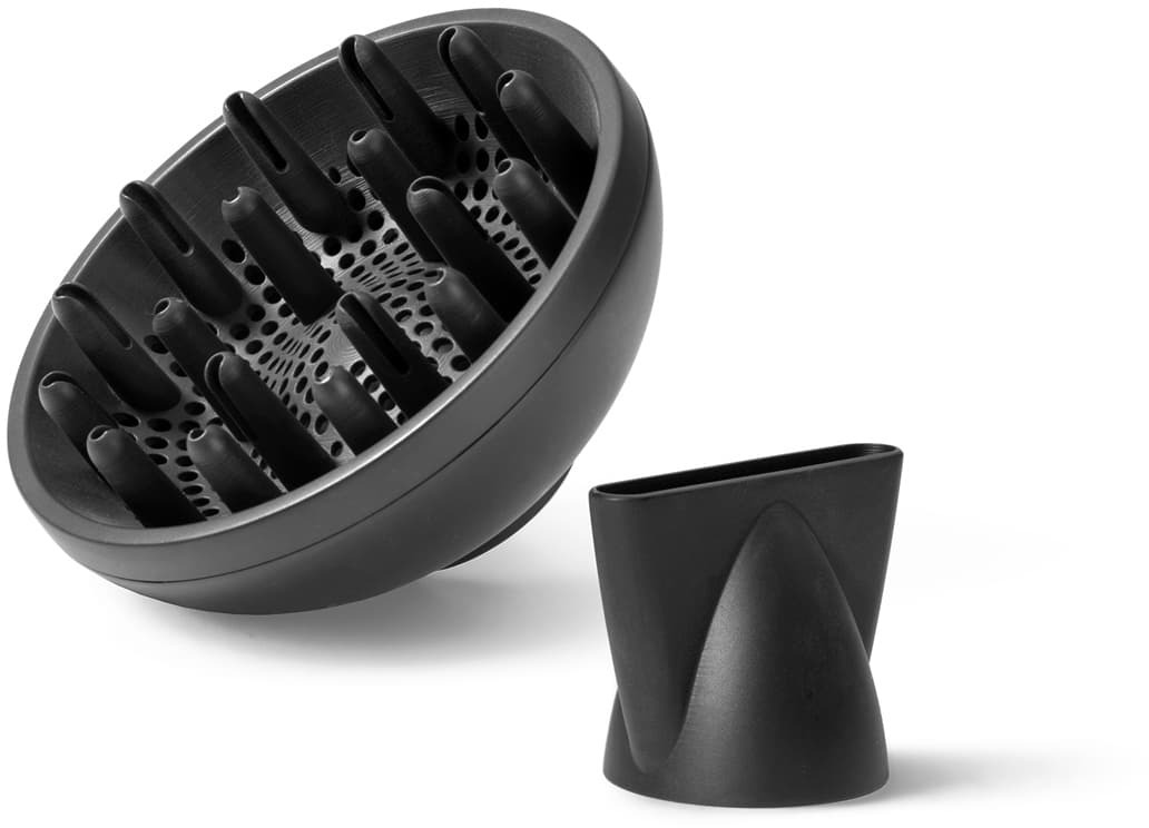 Гнучкі налаштування: 3 температурні режими, 2 швидкості потоку повітря + кнопка холодного обдуву для фіксації укладки. У комплекті дві професійні насадки: вузький концентратор для ідеально рівних прямих пасм та широкий дифузор для створення об'ємних хвиль, локонів і природної текстури.