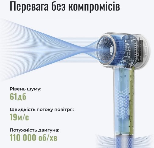 Попри мініатюрні розміри, Laifen MINI оснащений безщітковим двигуном нового покоління зі швидкістю до 110 000 об/хв. Ретельно оптимізований повітряний потік забезпечує високу ефективність сушіння з максимальною швидкістю повітря до 19 м/с, доводячи, що потужність може бути компактною. Ресурс двигуна розрахований приблизно на 800 годин роботи, що гарантує надійність у щоденному використанні.