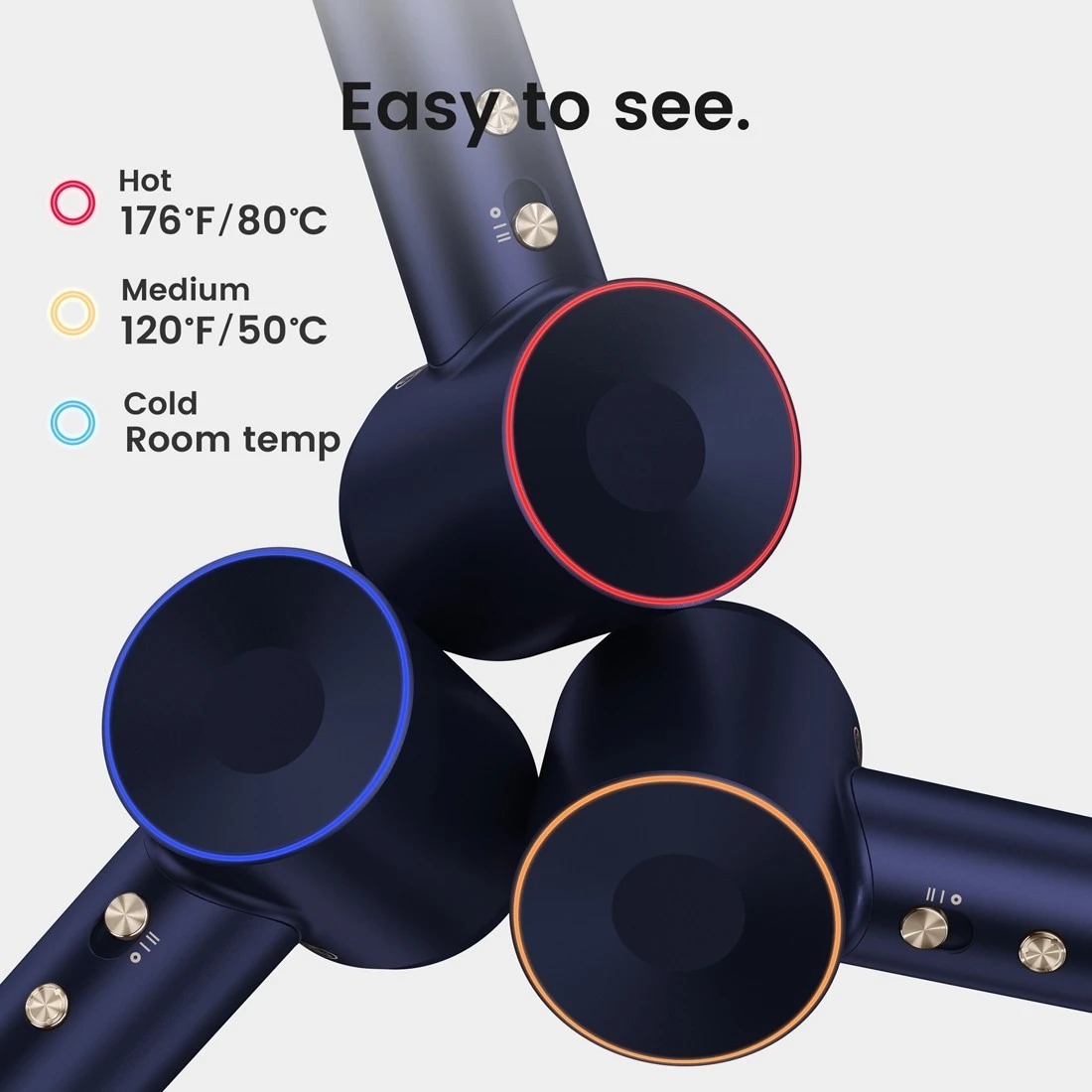 Під час роботи фен використовує інтелектуальне керування теплом: вбудований термодатчик контролює температуру повітряного потоку 100 разів на секунду, запобігаючи перегріву та зберігаючи волосся здоровим і зволоженим. Доповнює цей контроль яскраве триколірне світлодіодне кільце, яке миттєво показує обраний режим: