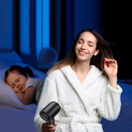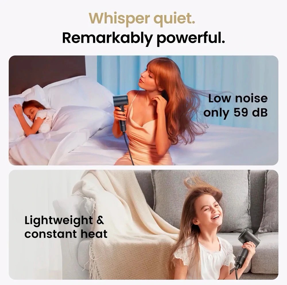 Особливу увагу приділено зниженню рівня шуму. Акустична оптимізація конструкції виводить електромагнітний шум за межі чутного діапазону, динамічне балансування зменшує вібрації двигуна, а продумана форма повітряної трубки та фільтрів знижує шум повітряного потоку. Безщітковий двигун додатково усуває звук тертя, роблячи використання фена максимально комфортним.
