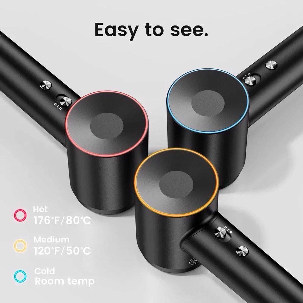 Інтелектуальна система керування теплом піклується про безпеку волосся: вбудований термодатчик перевіряє температуру повітря на виході до 100 разів на секунду, запобігаючи перегріву й зменшуючи ризик пошкодження волосся. Для зручності користування фен оснащений триколірним світлодіодним кільцем, яке миттєво показує обраний режим: