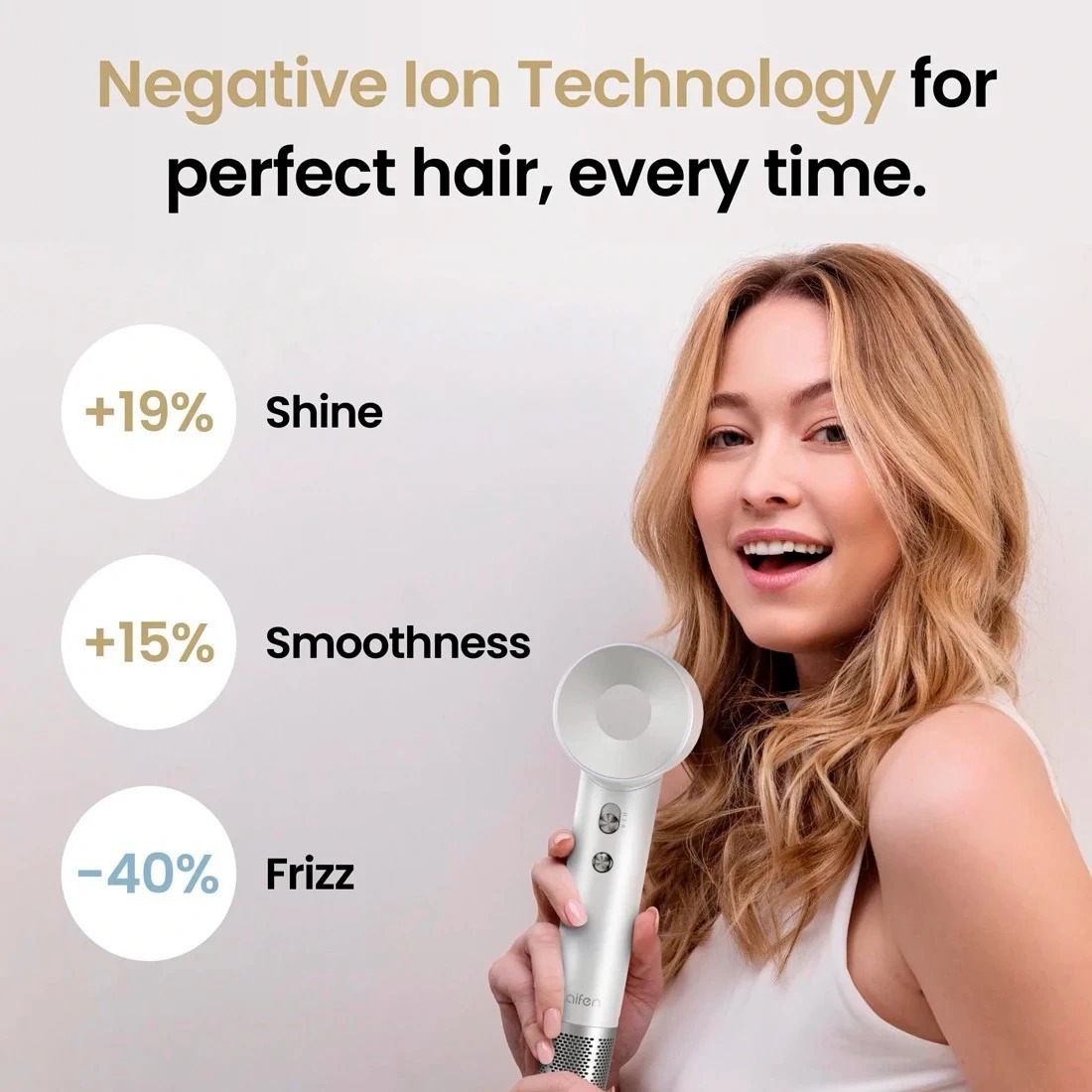 Догляд за волоссям доповнює технологія іонізації з генерацією до 200 мільйонів негативних іонів на см³. Вона зменшує статичну електрику, бореться з пухнастістю й сухістю, повертає волоссю гладкість і природний блиск, одночасно захищаючи його від пилу та забруднень.