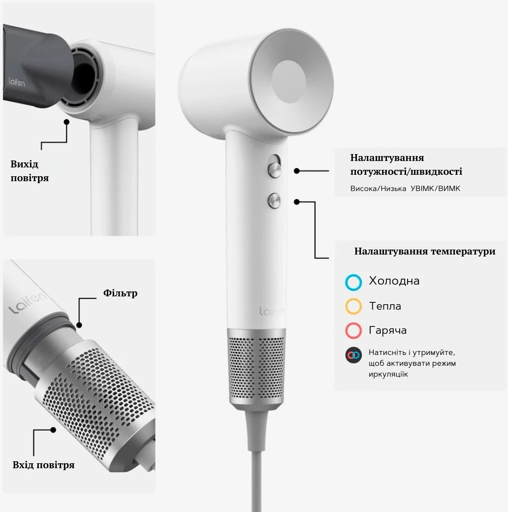 В основі роботи Laifen Swift Special — потужний двигун зі швидкістю до 110 000 об/хв, який подає близько 13 літрів повітря щосекунди. Посилений і точно спрямований повітряний потік утворює контрольований високошвидкісний струмінь, що значно скорочує час сушіння та дозволяє легко формувати бажану укладку.