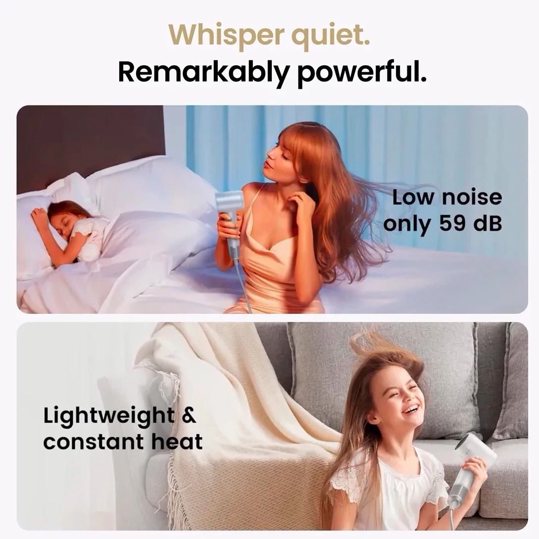 Особливу увагу приділено зниженню рівня шуму. Акустична оптимізація конструкції виводить електромагнітний шум за межі чутного діапазону, динамічне балансування зменшує вібрації двигуна, а продумана форма повітряної трубки та фільтрів знижує шум повітряного потоку. Безщітковий двигун додатково усуває звук тертя, роблячи використання фена максимально комфортним.