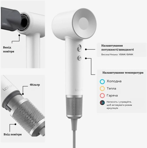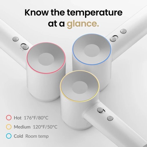 Інтелектуальна система керування теплом піклується про безпеку волосся: вбудований термодатчик перевіряє температуру повітря на виході до 100 разів на секунду, запобігаючи перегріву й зменшуючи ризик пошкодження волосся. Для зручності користування фен оснащений триколірним світлодіодним кільцем, яке миттєво показує обраний режим:
