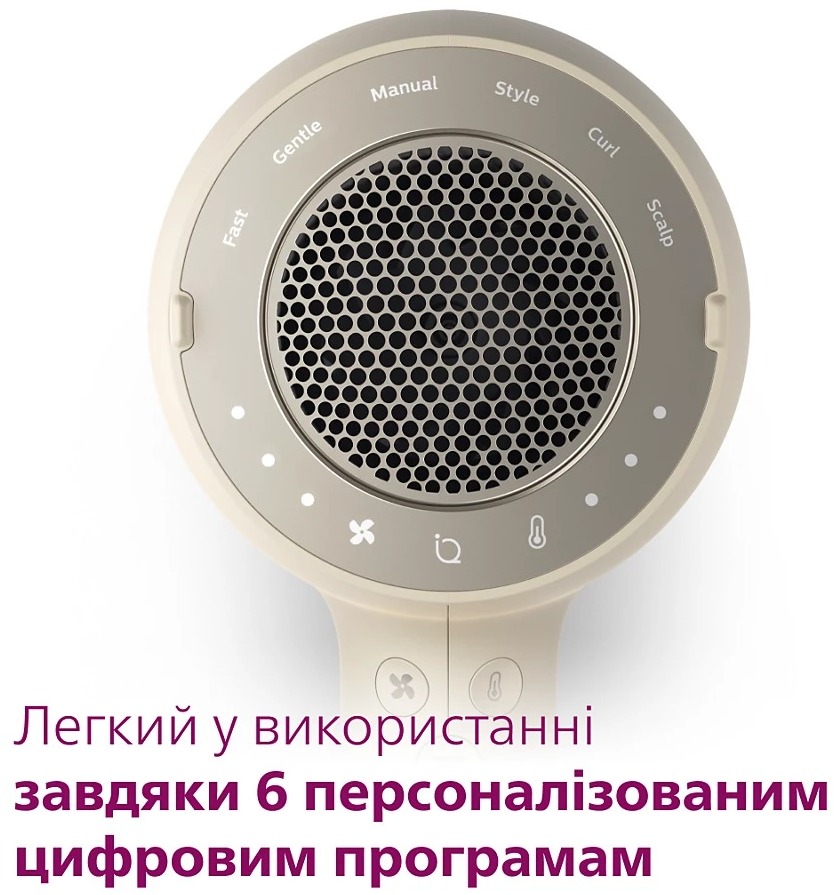 Для індивідуального підходу передбачено 6 персоналізованих цифрових програм і ручний режим із трьома рівнями потужності та температури. Розумна система автоматично підбирає оптимальний режим після під’єднання насадки — хай то сушіння, укладка, завивка чи масаж голови. Також доступна кнопка холодного обдування для фіксації укладки.