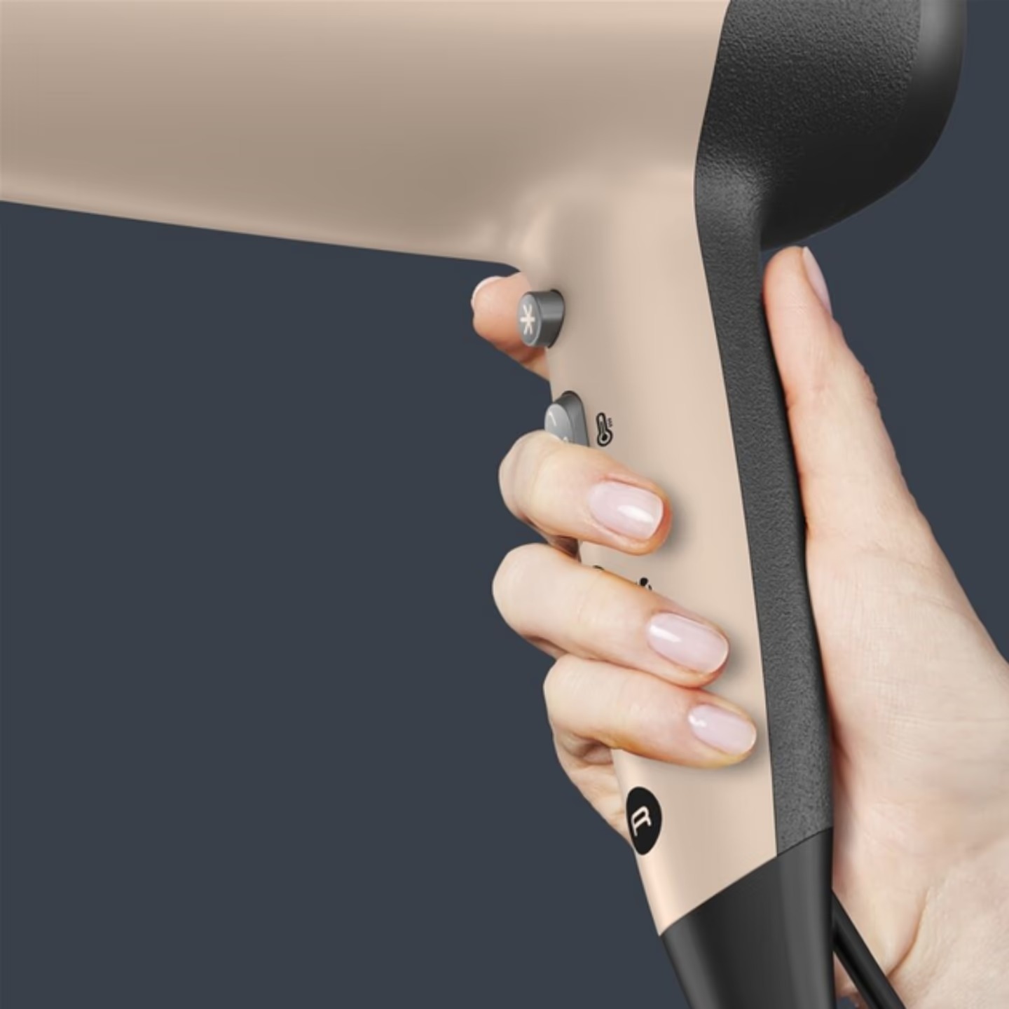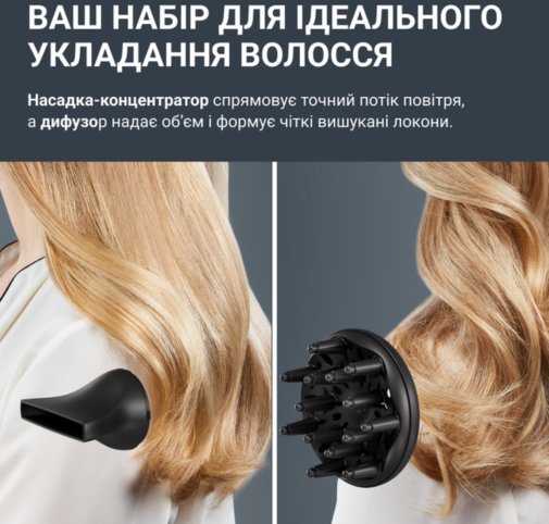 Для бездоганної зачіски щодня фен пропонує 6 налаштувань швидкості та температури, потік холодного повітря для фіксації укладання та іонний генератор, який надає волоссю блиску та зменшує пухнастість. Насадка-концентратор спрямовує потік повітря для точного укладання, а дифузор додає об’єму та формує локони.