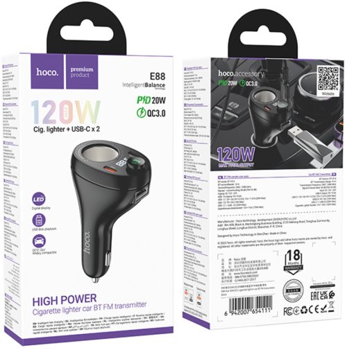 Hoco E88 Star — це універсальний помічник у дорозі, який поєднує швидку зарядку, FM-трансмітер і гучний зв’язок в одному компактному корпусі. Під'єднавши його до гнізда прикурювача, ви одразу отримуєте два потужні порти USB-C загальною силою 35 Вт — достатньо, щоб одночасно швидко заряджати смартфон і планшет чи навігатор.