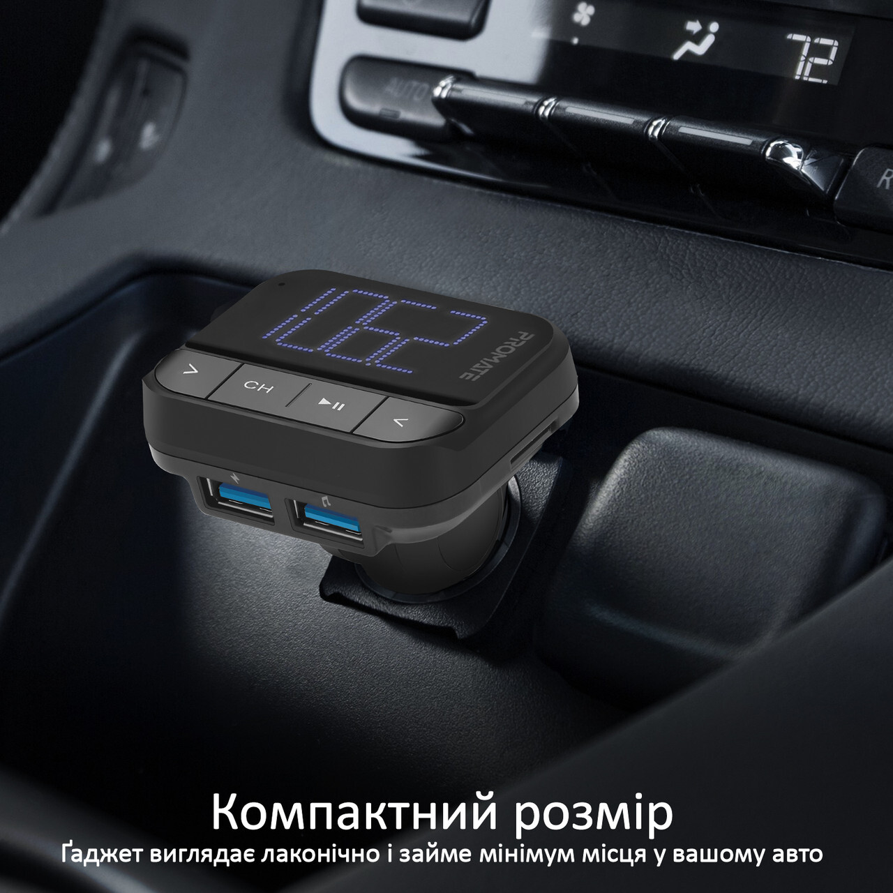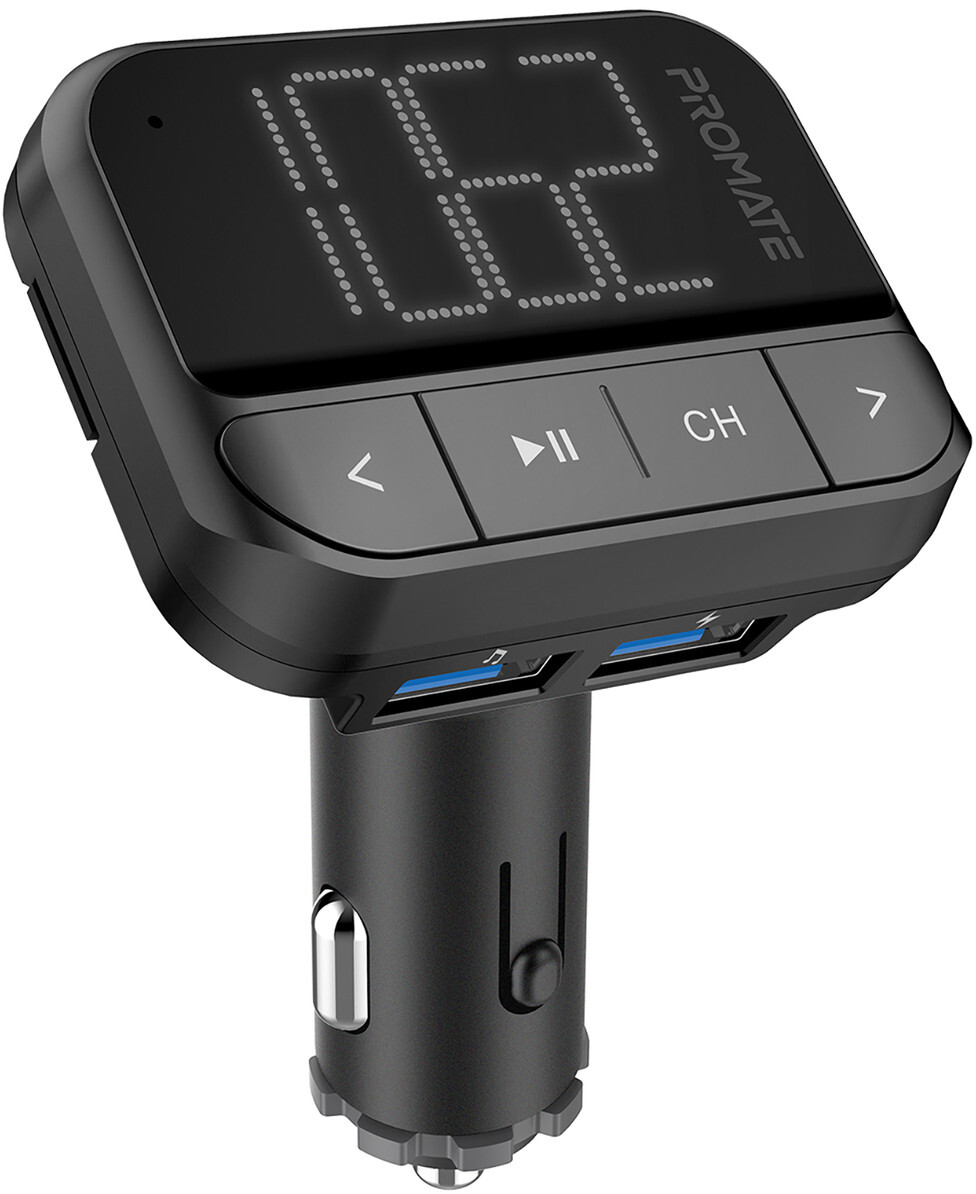 Promate ezFM-2 — це компактний і надійний FM-трансмітер, який легко перетворює будь-яку автомобільну магнітолу на сучасний музичний центр. Завдяки трьом способам відтворення ви завжди матимете доступ до улюблених треків: вставте MicroSD-карту чи USB-флешку, або під'єднайте телефон чи плеєр через комплектний AUX-кабель.