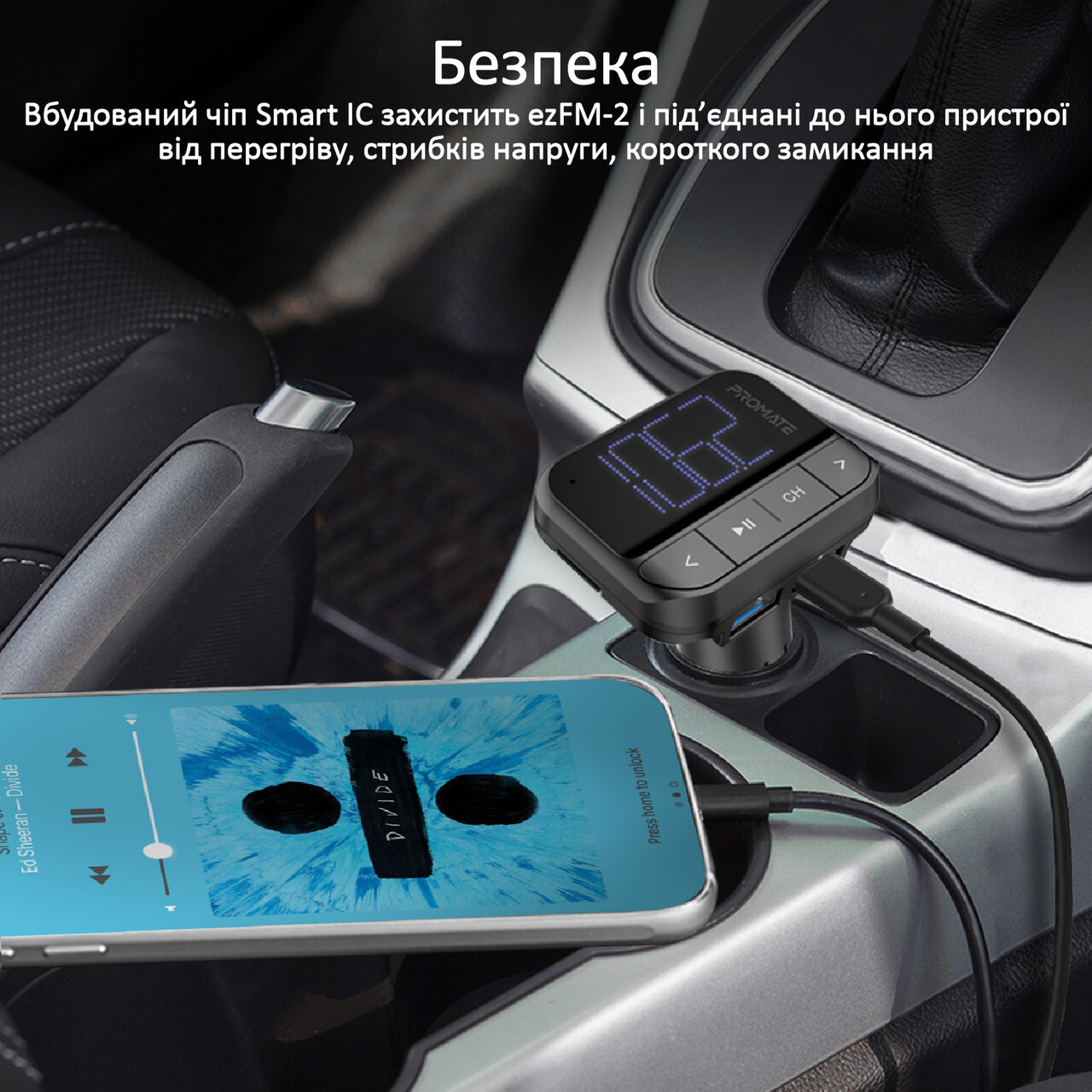 Одночасно ezFM-2 виконує роль зарядного пристрою: порт USB видає до 2,4 А (12 Вт), що забезпечує швидку й безпечну зарядку смартфона чи планшета. Розумний чіп Smart IC надійно захищає від перегріву, короткого замикання та стрибків напруги.