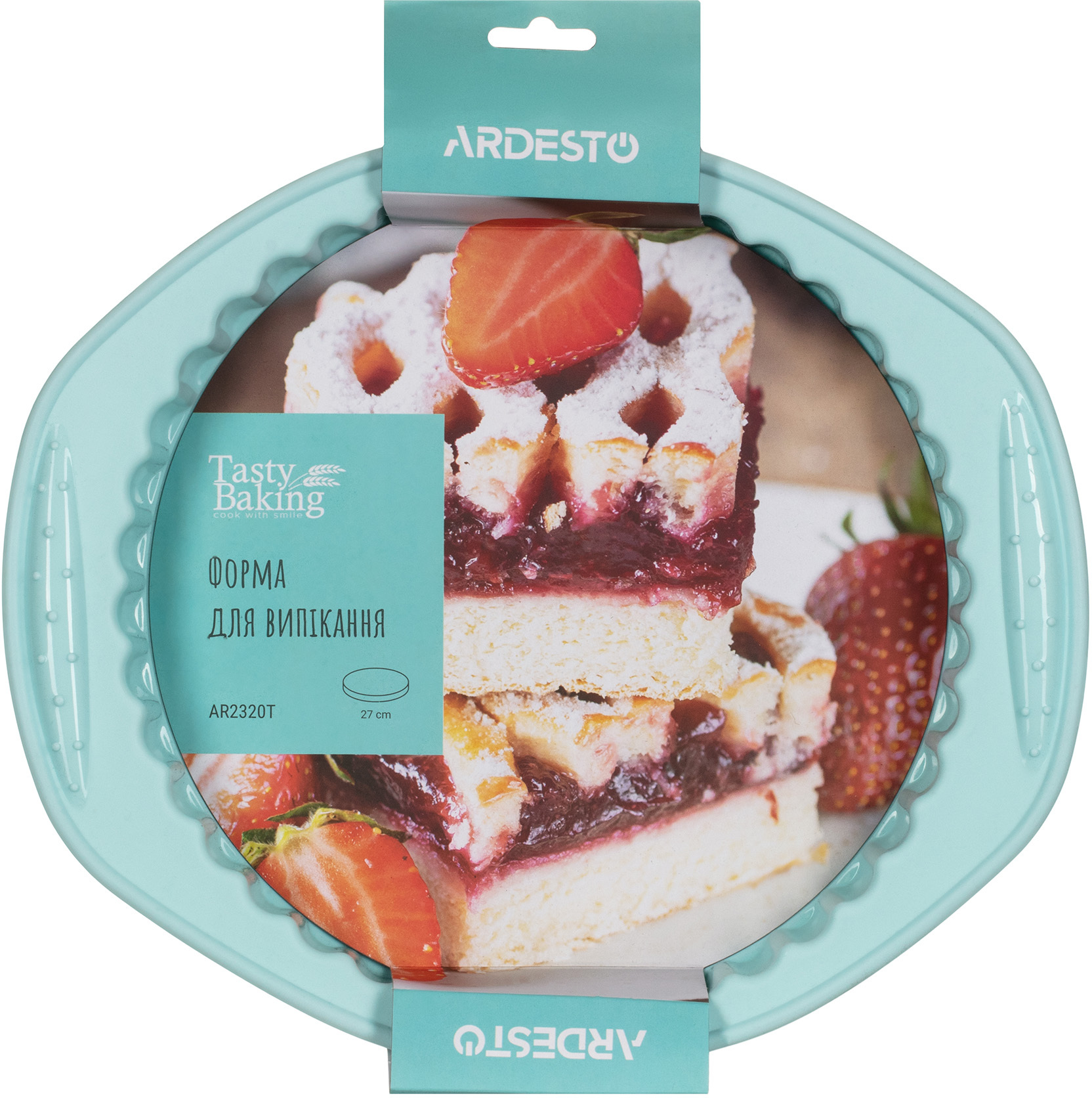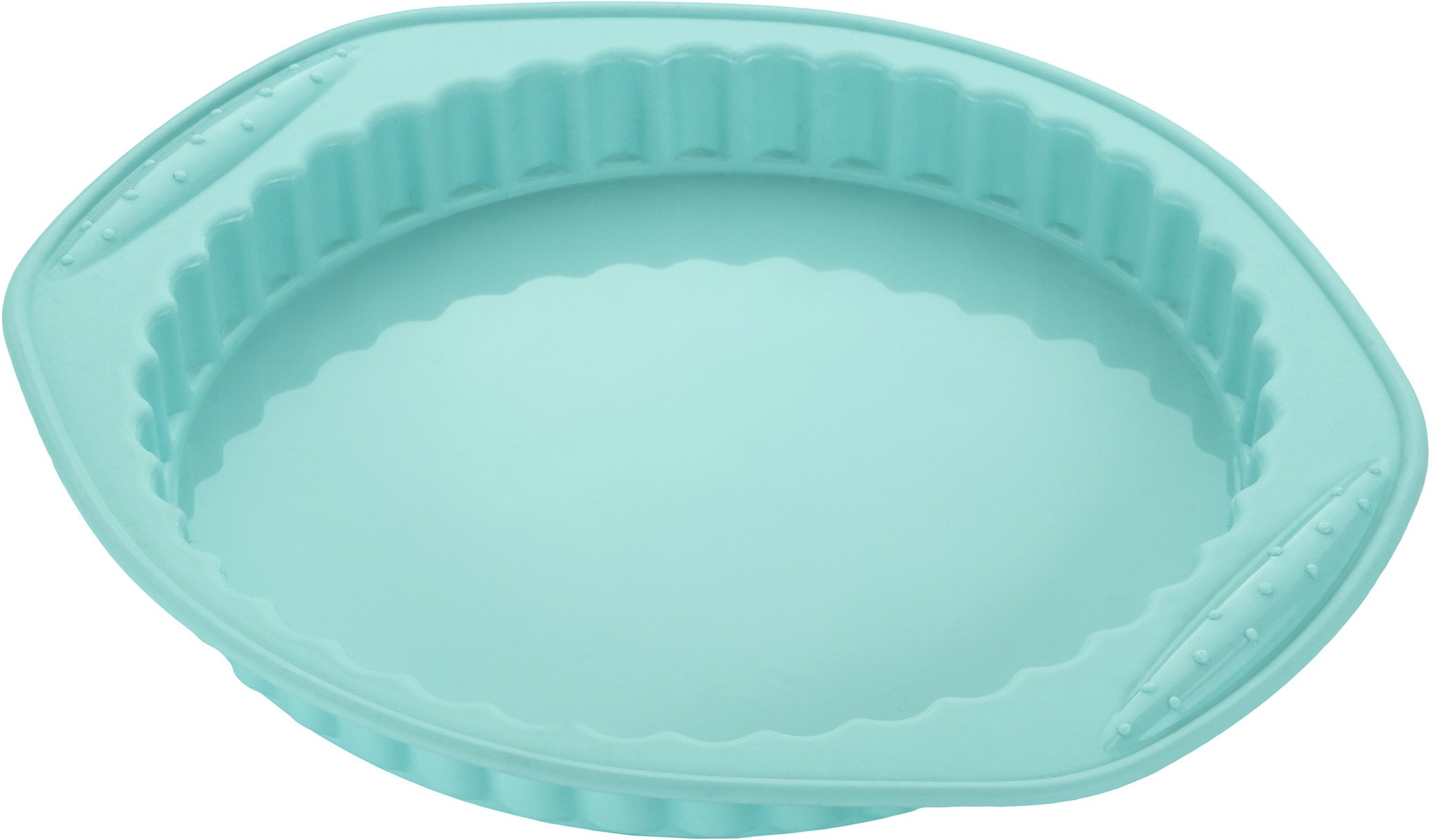 Силіконова форма для випікання блакитного кольору, кругла, розміром 30,5 × 27,3 см. Термостійка – витримує температуру до 200 °C. Мити в посудомийній машині не можна.