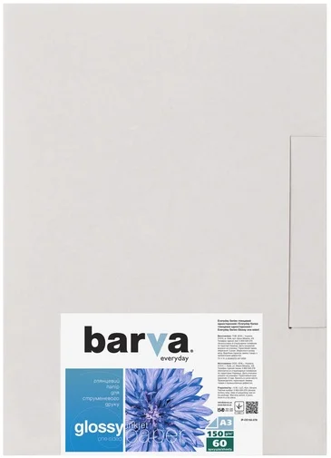 Глянсовий фотопапір виробництва BARVA. Призначений для друку чорнилами на струменевих принтерах. Характеризується щільністю (150 г/м²). Формат аркушу - А3. Забезпечить відмінну якість друку широкого спектру матеріалів. У комплекті поставляється 60 аркушів.