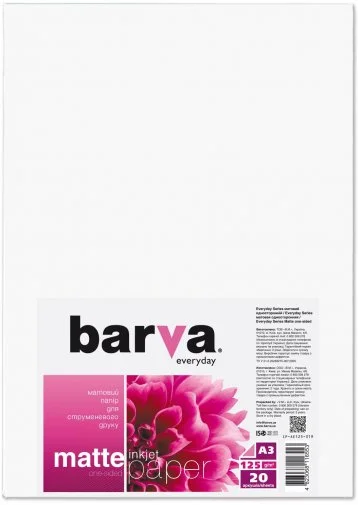 Матовий фотопапір виробництва BARVA. Призначений для друку чорнилами на струменевих принтерах. Характеризується щільністю (125 г/м²). Формат аркушу - A3. Забезпечить відмінну якість друку широкого спектру матеріалів. У комплекті поставляється 20 аркушів.